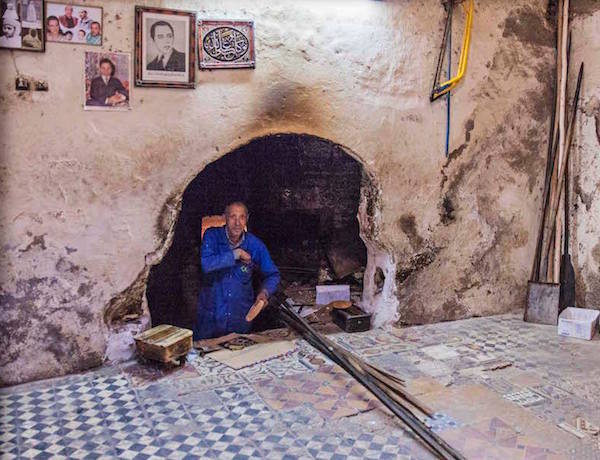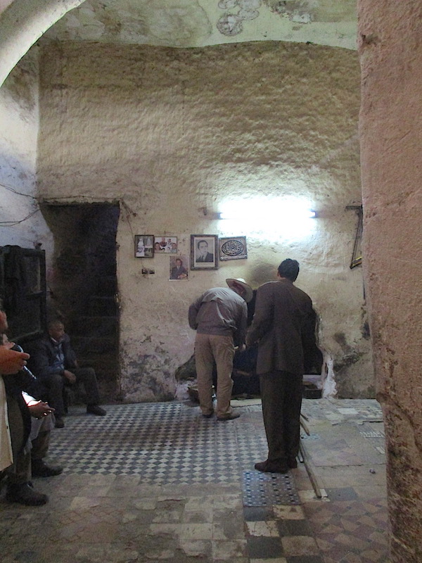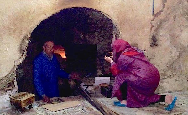 We walk to the back of one of the souks, where the oldest caravansary stands, or at least the remains of it, since it now appears to be a dumping ground for junk and trash. Here is a bakery, with the oven so deep inside the building that the baker uses 6-8 foot paddles to move the loaves around in the wood fired oven.