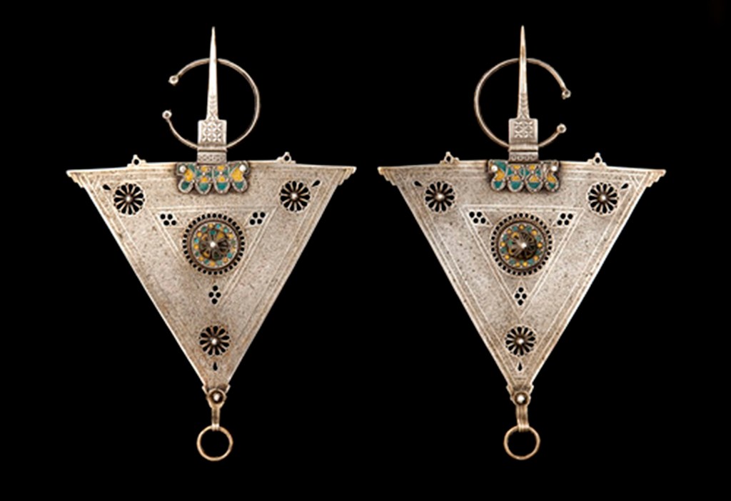 Of all the places to not allow photographs !!!  Itโ€™s a compact space, set under a dark ceiling pierced with lights to simulate stars, and exhibiting ethnic clothing, jewelry and household implements.  There was a dazzling array of jewelry and headdresses which I noted bore similarities to Mongolian jewelry. In both nomadic cultures, women wore their wealth in the form of finely crafted silver, studded with coral. Where Mongolian women also used turquoise, the Berber women used amber and amazonite. I recognized some of the pieces as being talismans, including fibula (shown in the first photo below) whose design I would find on doors throughout the country, and which I would work into a hat design when I returned home.