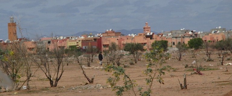 After passing through an unremarkable landscape, our first glimpse of Marrakech is of a medina in the distance, with a mass of rooftop satellite dishes offering a stark contrast to both the sand colored walls and the brilliant blue sky.
