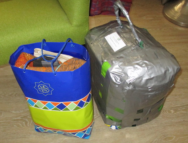 After realizing that I had no suitcase, and in fact had added to my cargo, I spend much of the night packing my most valued treasures into a shopping bag that would serve as my carry-on, and turning a Tyvec grocery bag and a roll of duct tape into something resembling a suitcase that I can check in at the baggage counter.