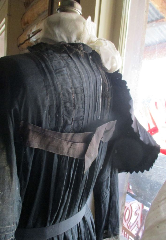 This black dress was particularly interesting for it’s sheer sleeves, and the detailing on the back. The front and skirt were elsewise unremarkable, and the ruffly thing is the edge of a parasol. I have no idea what decade this ensemble dates from.