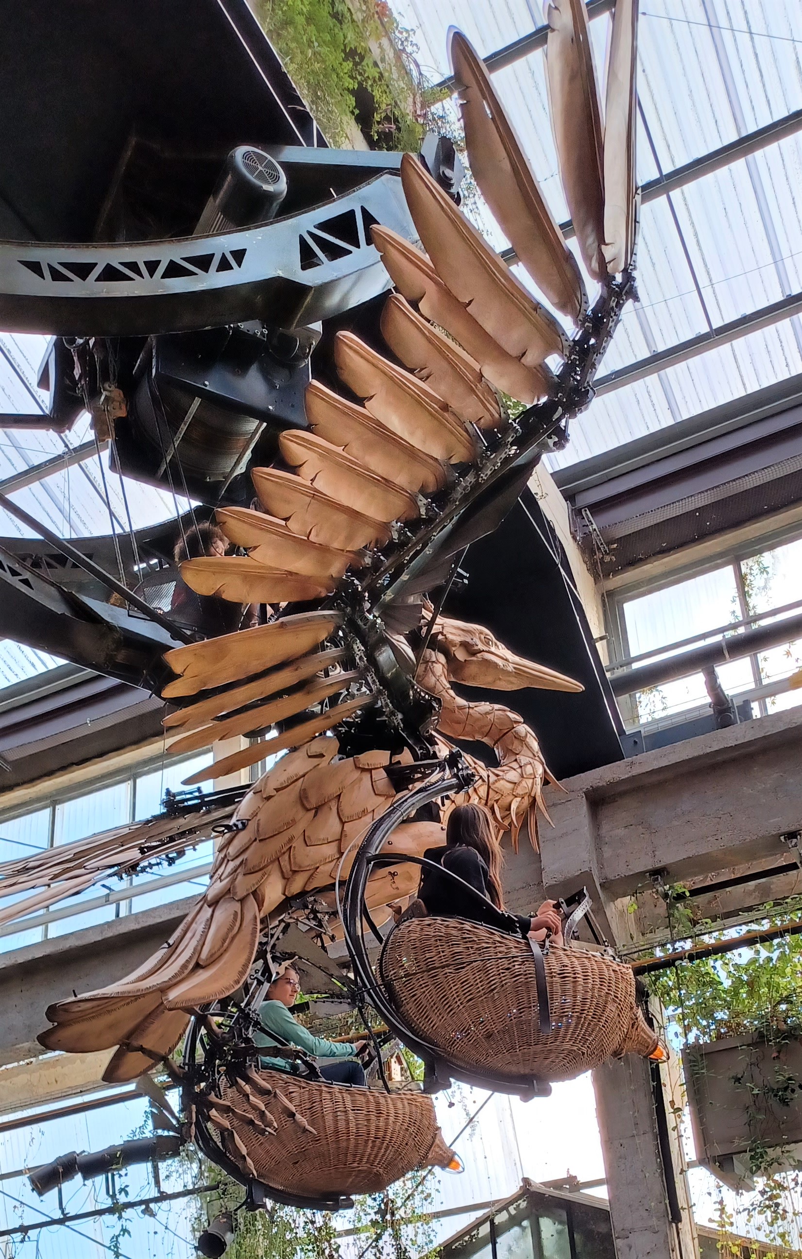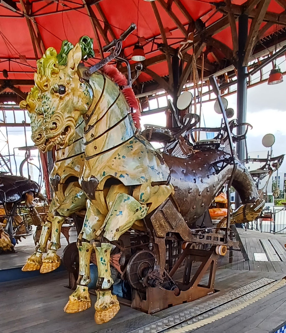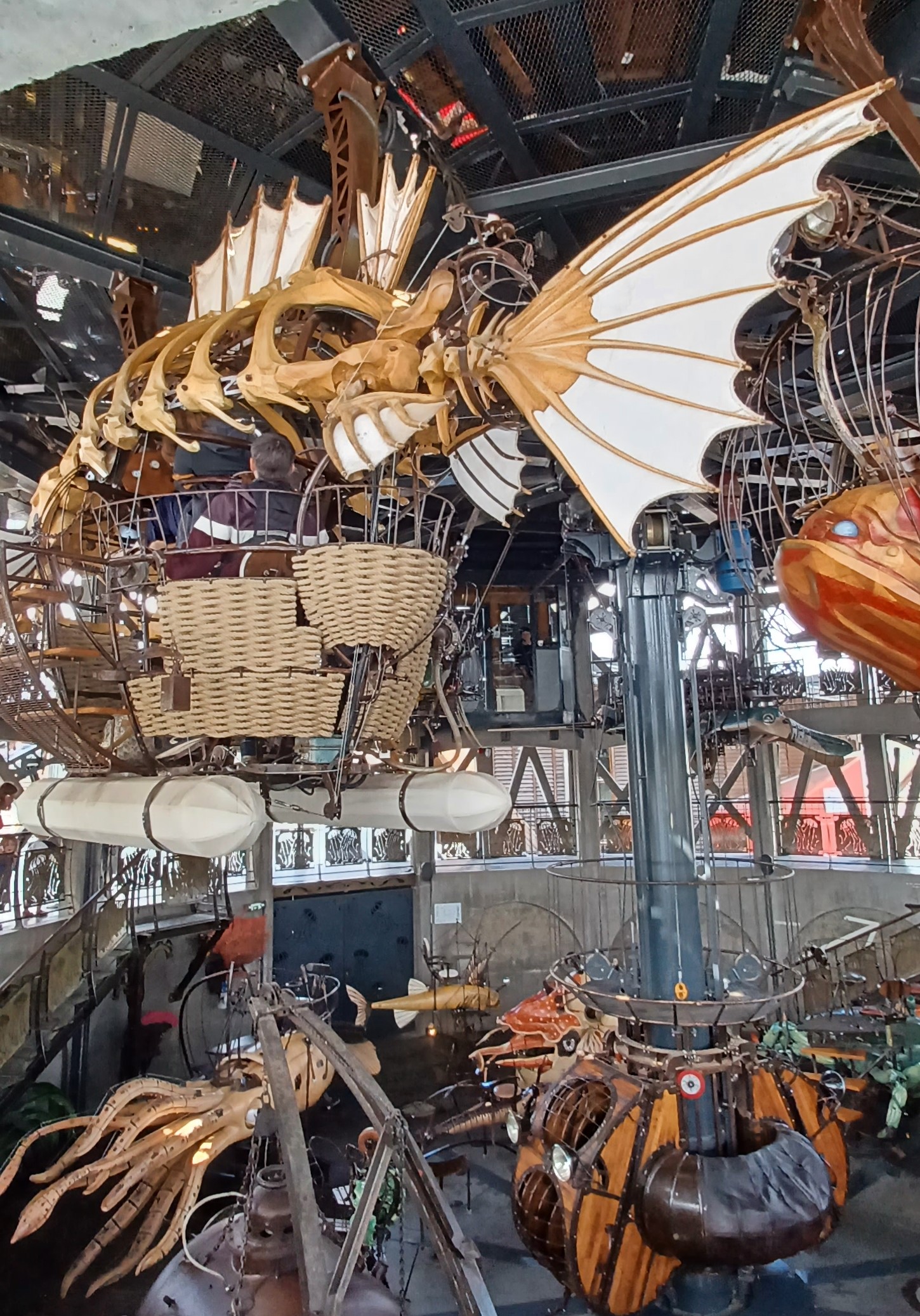 When it’s time to enter the gallery, I’m mildly disappointed at not being able to ride any of the animals even though I see others who have been given that opportunity. But it’s a really fascinating place. I would learn a few days from now that Les Machines is a three-part project covering nearly two decades of planning and funding. The Grand Elephant was the first piece of the plan, the Carousel was the second, and the third, currently in progress, is the Grand Heron Tree. The mechanical elements are built in the factory on the right side of the complex, and displayed in the Gallery on the left before moving to their permanent home in either the Carrousel or the Heron Tree.