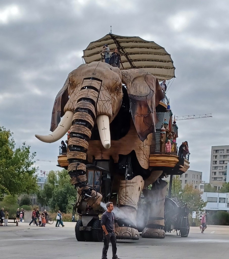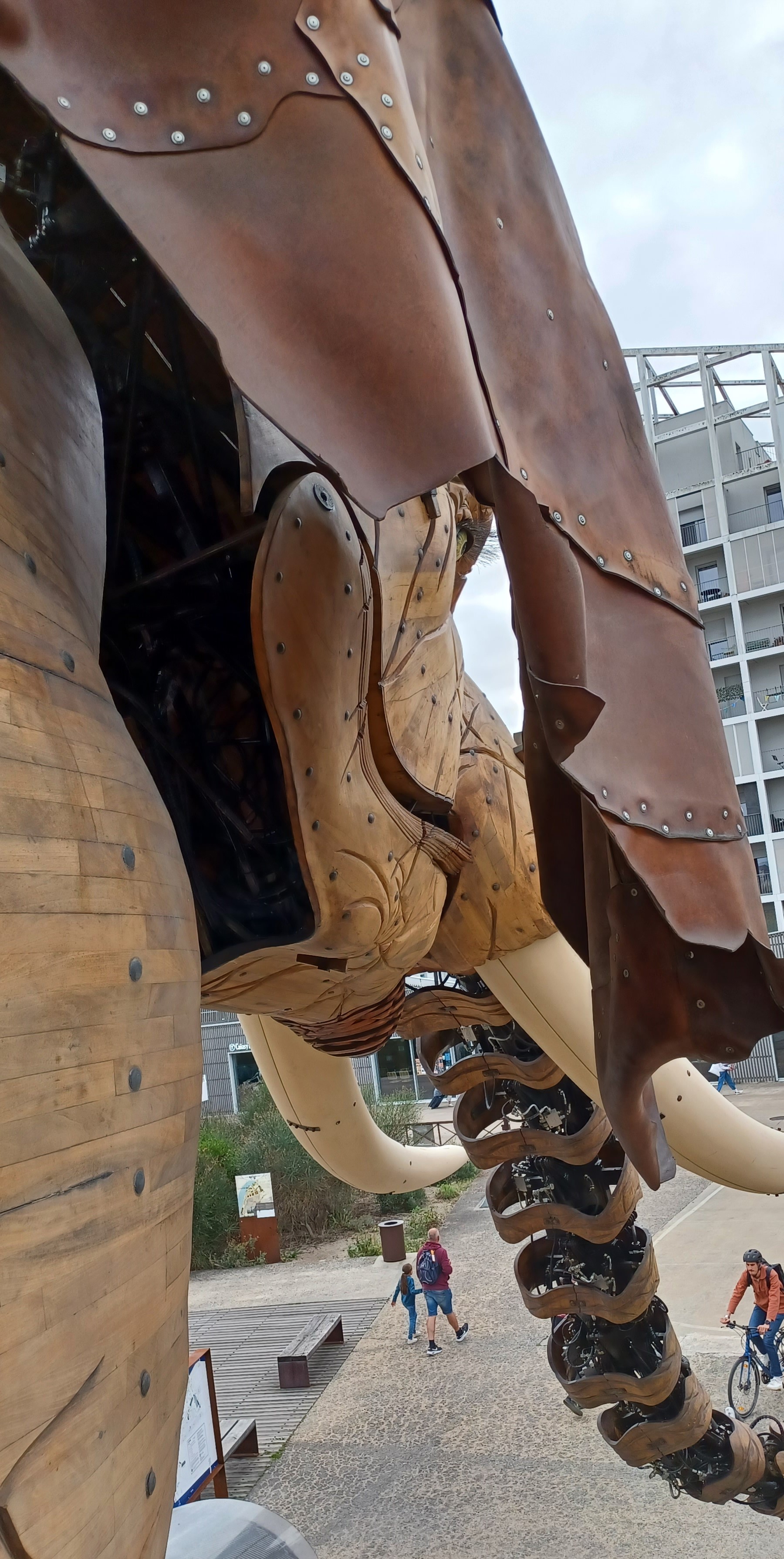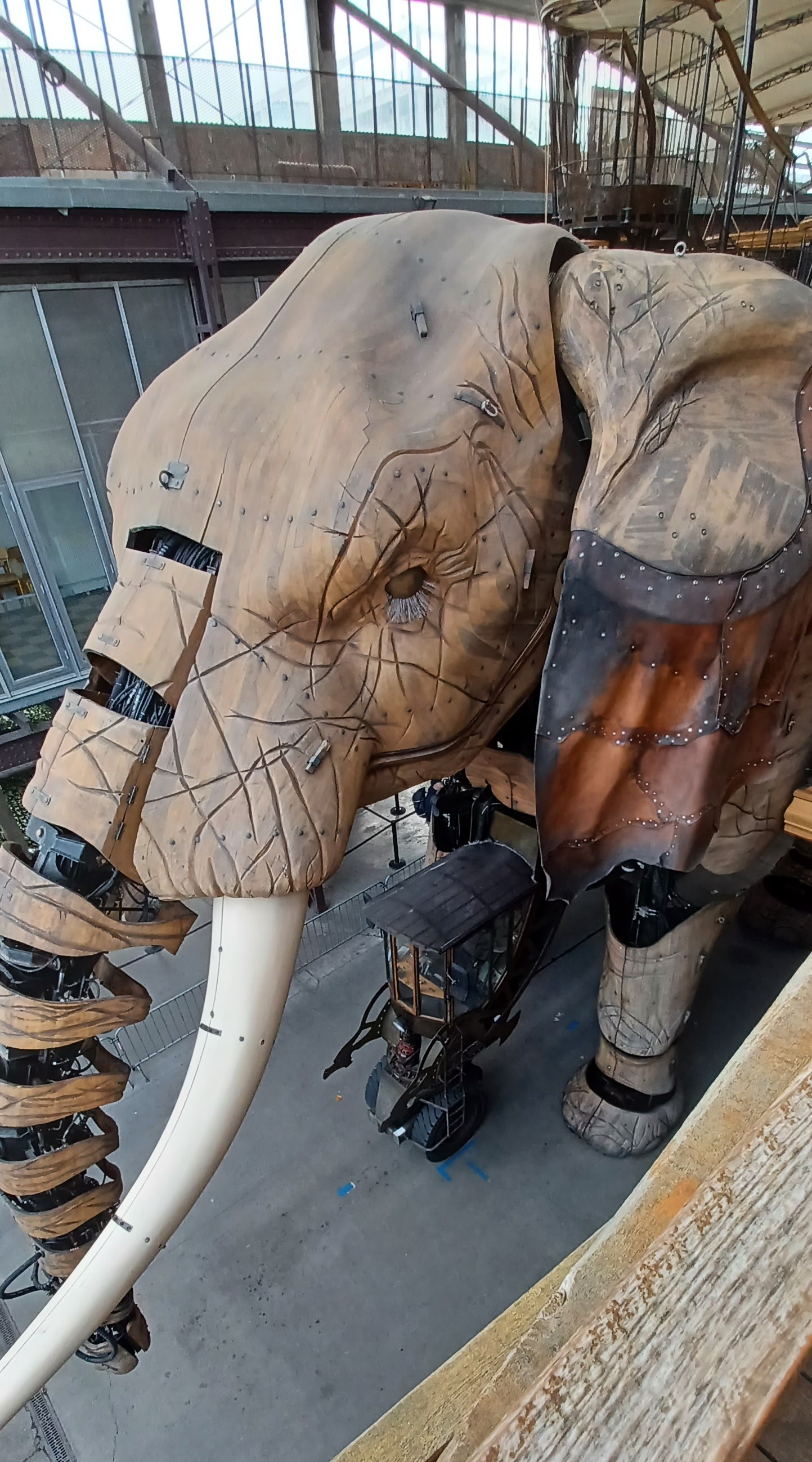 I came back the next day to ride The Grand Elephant. It is three times the size of a live elephant and might be compared in size to a mammoth. The body is made from planks of tulip tree wood, which is not fibrous and has no knots, and is very lightweight. It took the skins of 5 cows to make each of the elephant’s ears. It took 150 people 30 months to build. It vocalizes like a real elephant and sprays water from its trunk on unsuspecting passersby. It is driven by a large engine in the back and guided by a navigator in a glass cage under the elephant’s chest. These are the shots I took yesterday while it was in its ‘garage’ between the Les Machines factory and gallery: