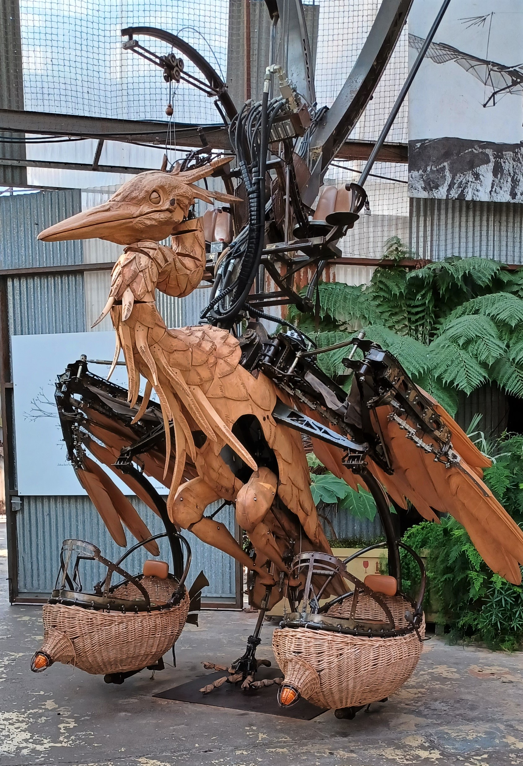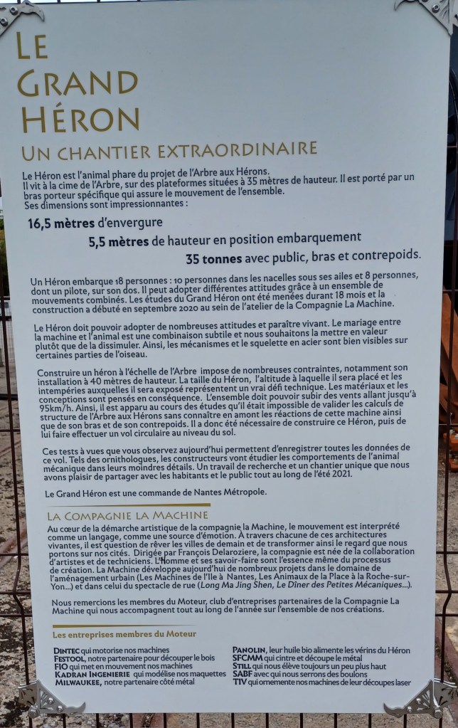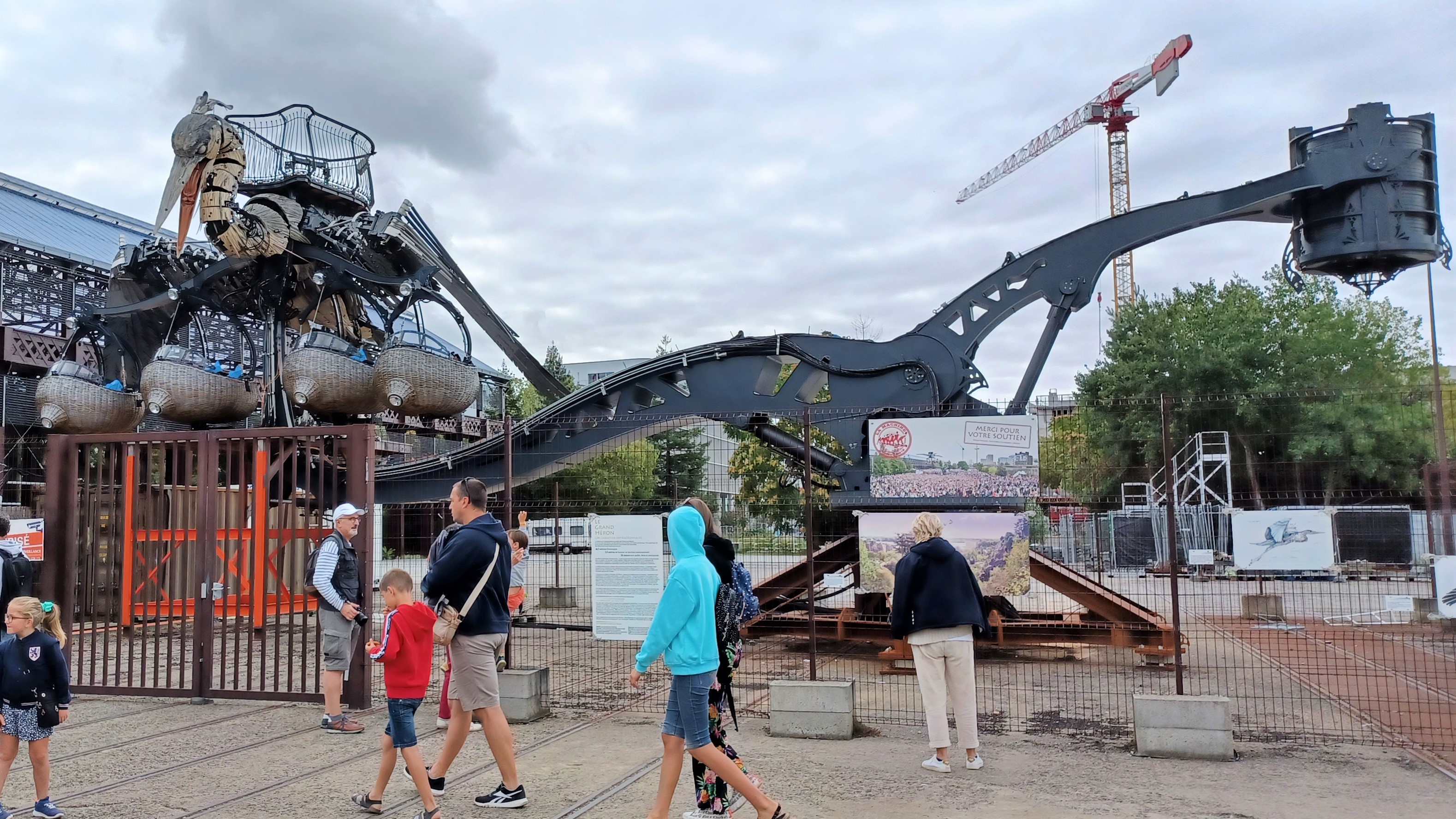 As we return to the Les Machines factory, I see the head of a heron peeking up over a fence. There are signs on the fence showing what it will look like when it is finished.