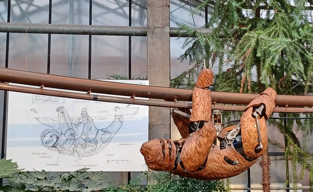 There is an articulated sloth with long steel nails that very slowly crawled along a steel pole. The schematic for this animal, as with several others, is posted on the wall near the feature: