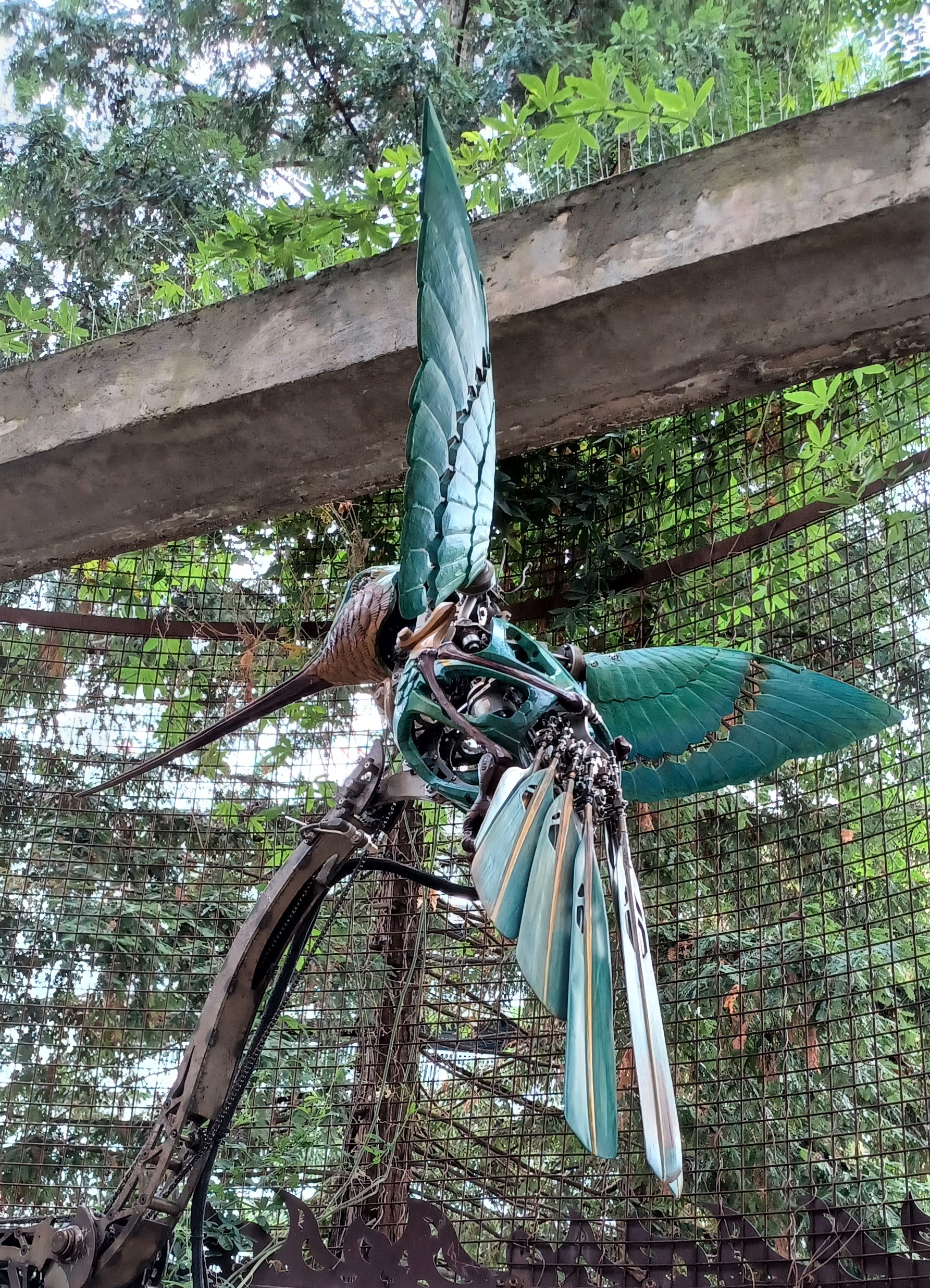 There are birds. Hummingbirds with a three foot wing span who move towards a metal blossom from which to feed. A pair of birds who do something like a mating dance while the technician sings a concerto: