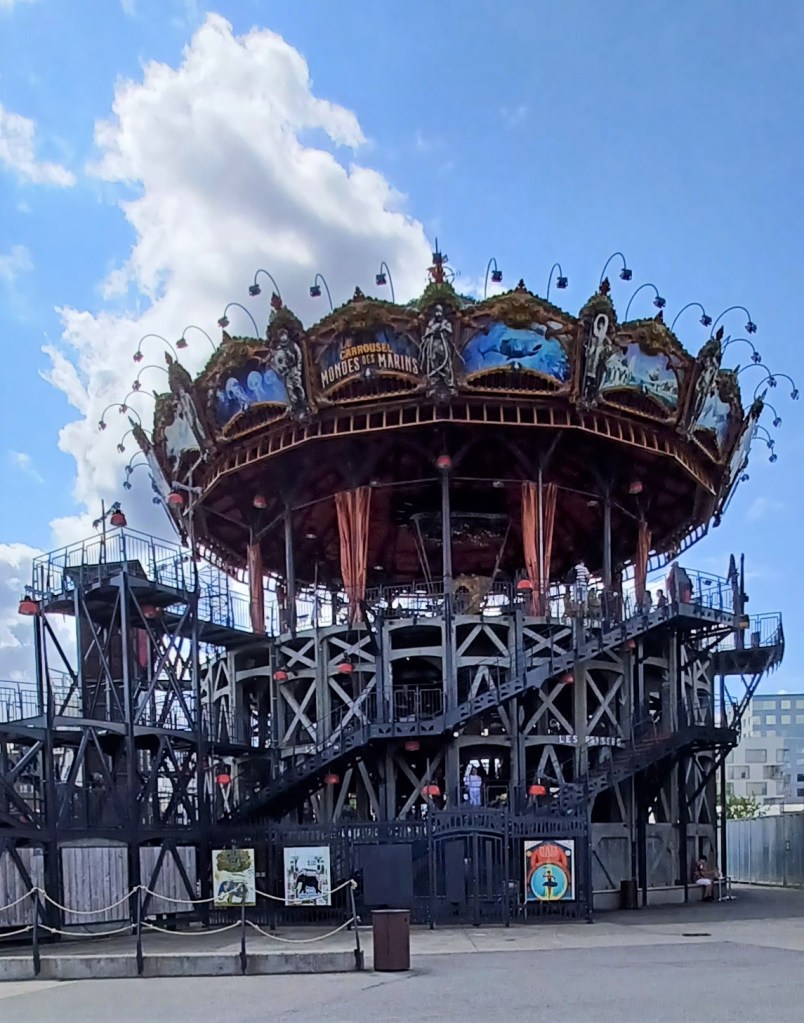 I was surprised to find the Carrousel des Mondes Marins open. It is 25 meters high, 20 meters in diameter, and has three levels filled with mechanical sea creatures and other deep ocean devices. You can watch as long as you want, and your ticket allows you one ride on any creature or device of your choosing.