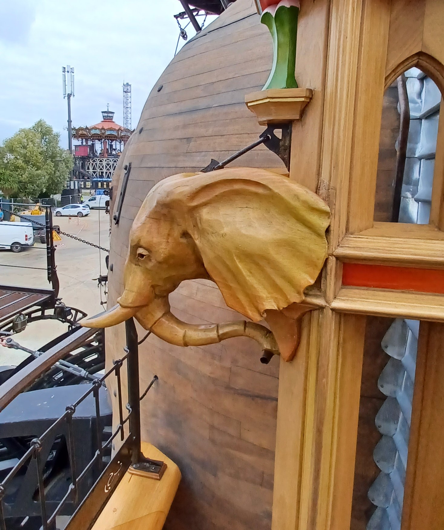 I had thought the best place to ride would be on top of the elephant’s back, but the more interesting ride was actually on one of the side platforms, where you could watch the mechanical beast at work. The elephant wiggles its ears and bats its eyelashes as it plods across the parking lot between the Carrousel and the Les Machines factory – a journey that takes about 30 minutes. See what it is like to ride the Grand Elephant on my YouTube channel