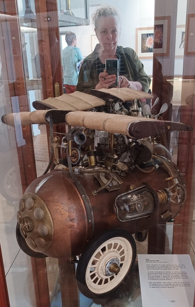 Jules Verne wrote of flying machines and submarines, and laid the foundation for future technologies based on projections from a 19th century aesthetic. In 1987, American author Kevin Jetter tapped into that aesthetic and coined the term “Steampunk” which became a worldwide cultural phenomenon. This is a Steampunk style model of “Spirit of Owl,” an aircraft from Jules Verne’s 1904 novel, Master of the World. The model dates to 2021. I actually thought briefly about going to Paris for the steampunk convention that was occurring, but could not get my bustle into my carry-on.