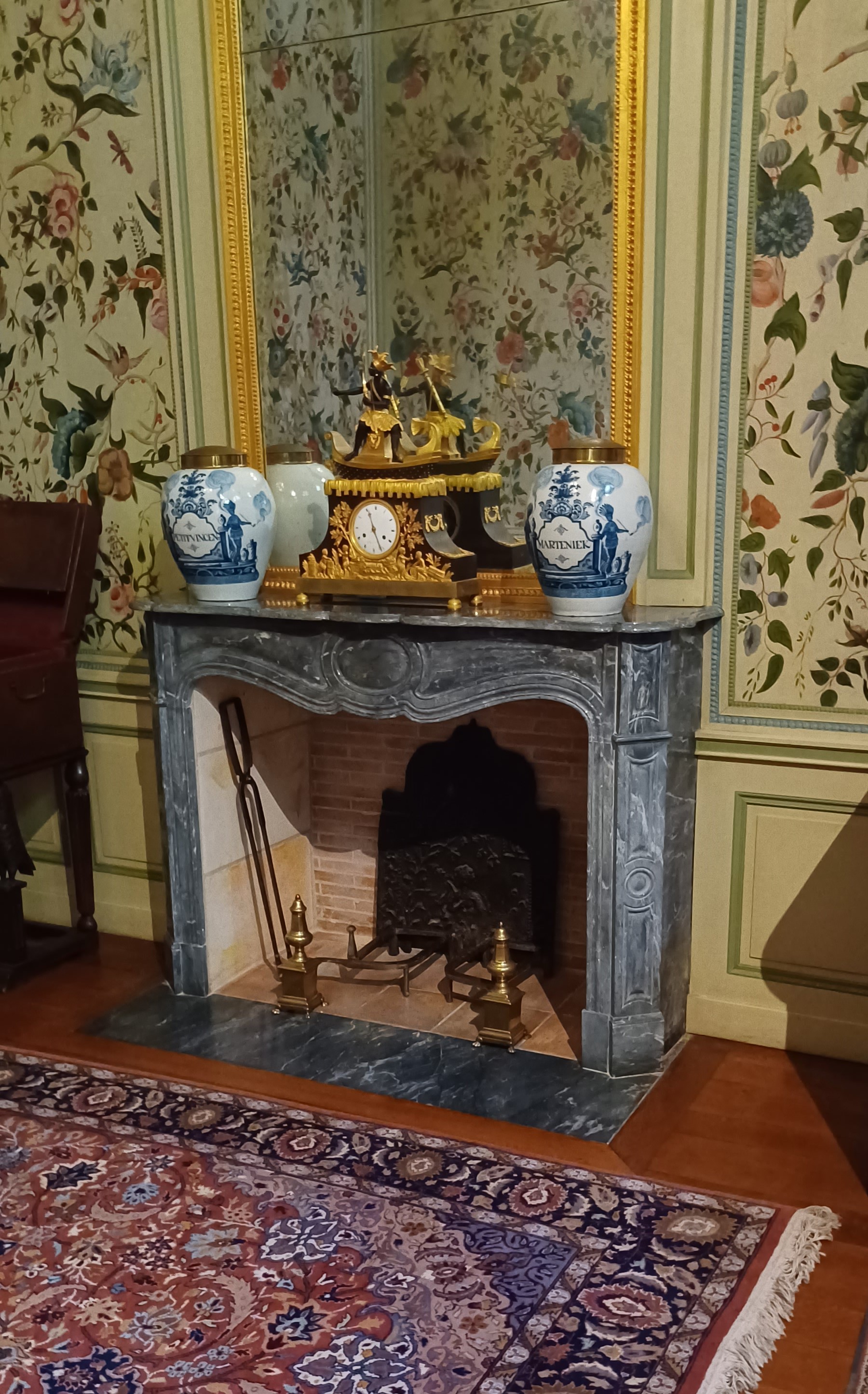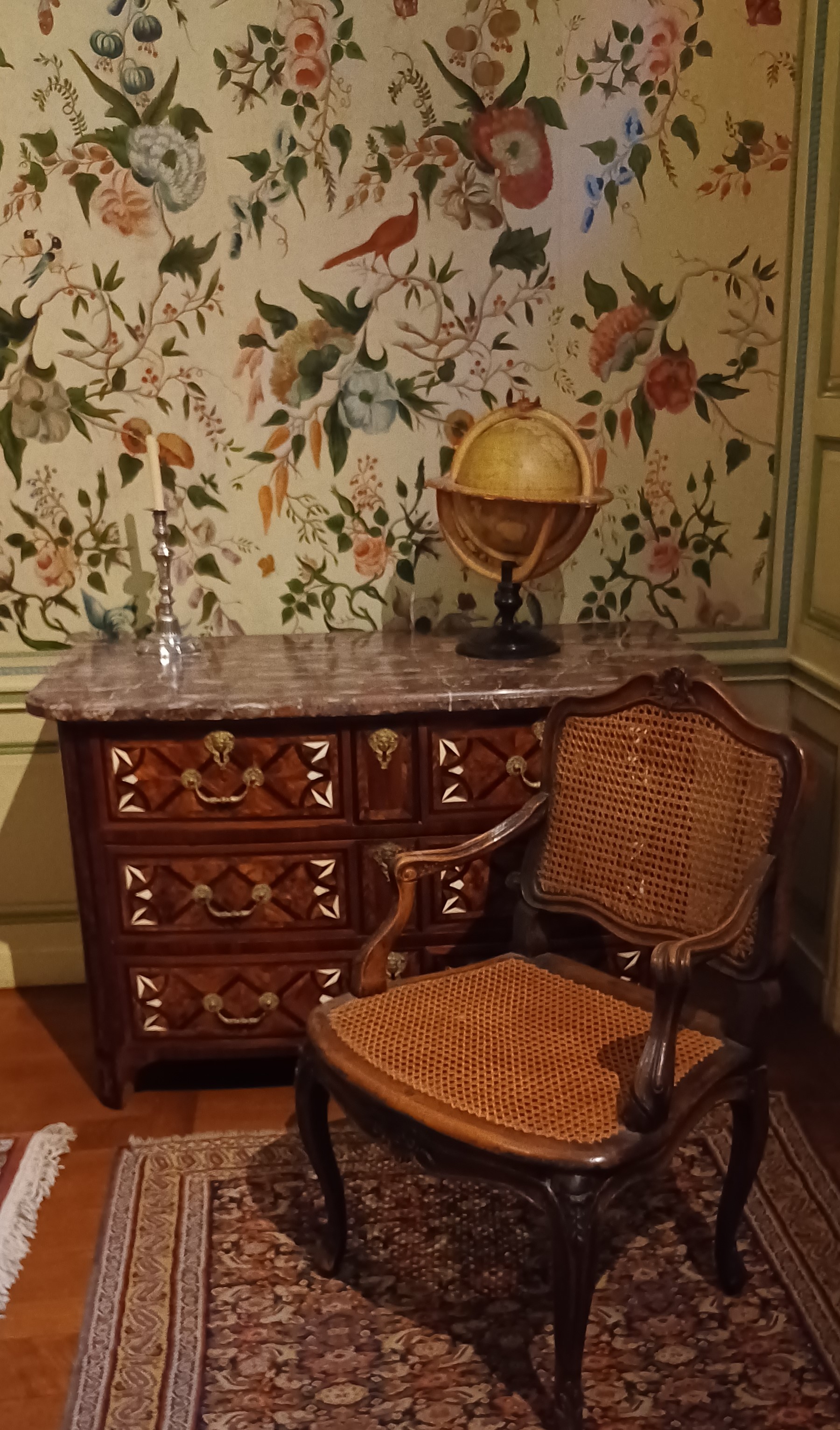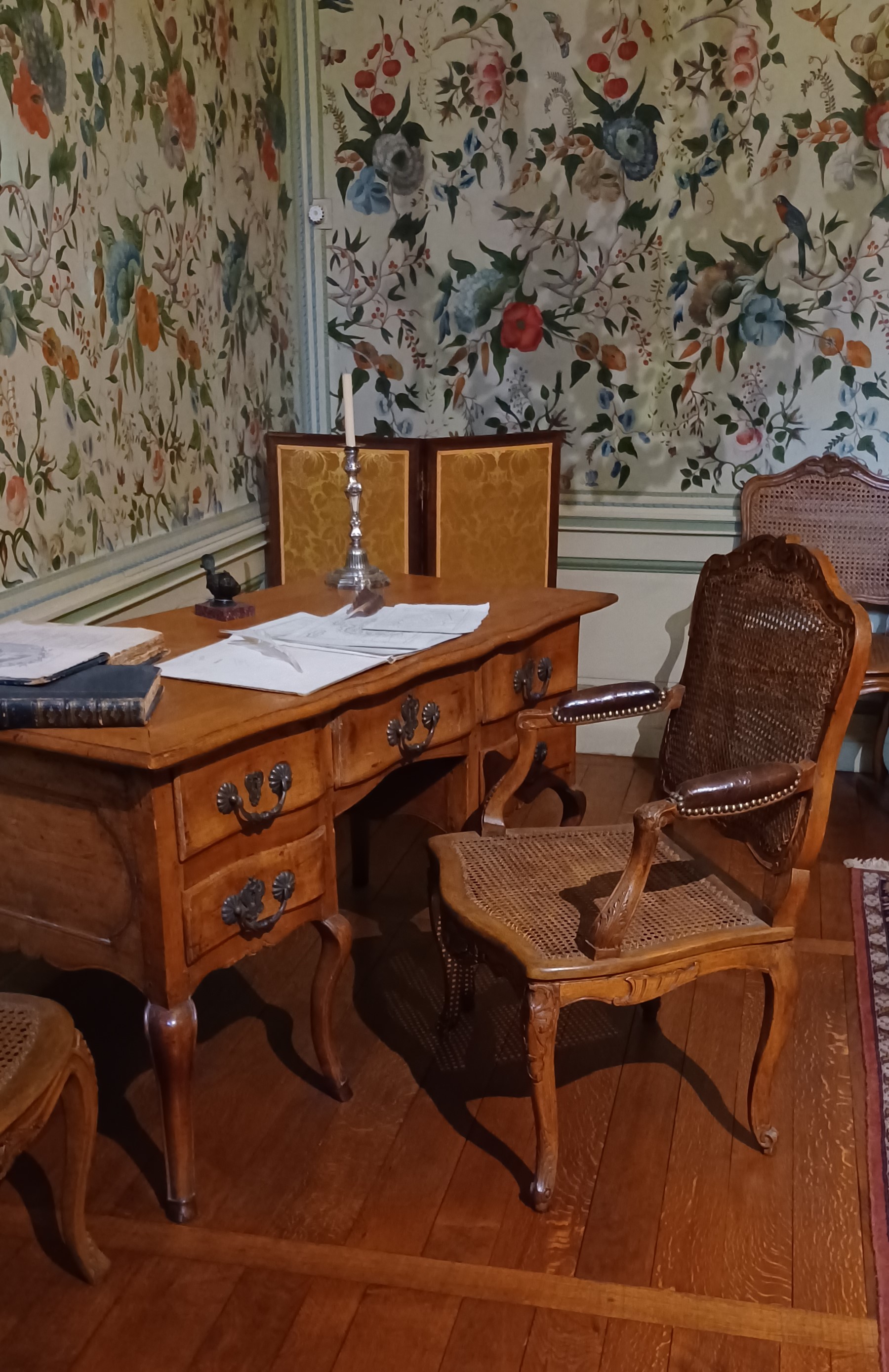 This studio is complete with furnishings true to the period of the home. The floral wallpaper imitates the printed fabrics that were forbidden in France between 1686 and 1759.