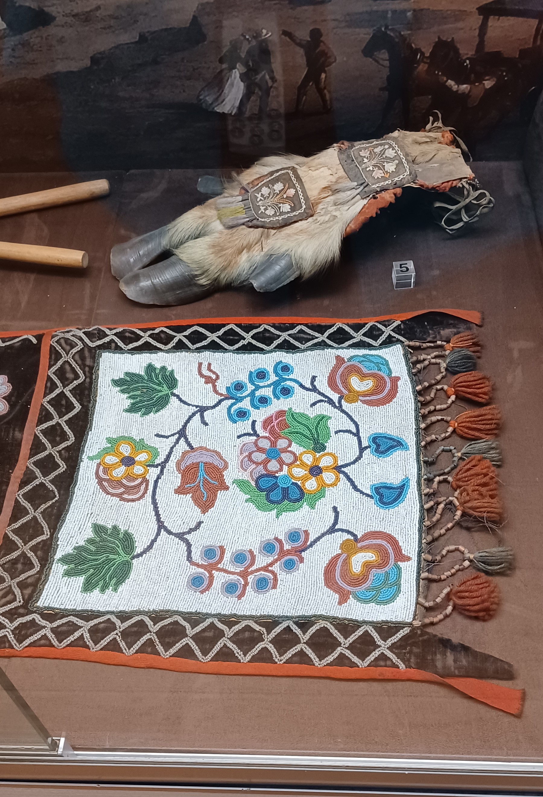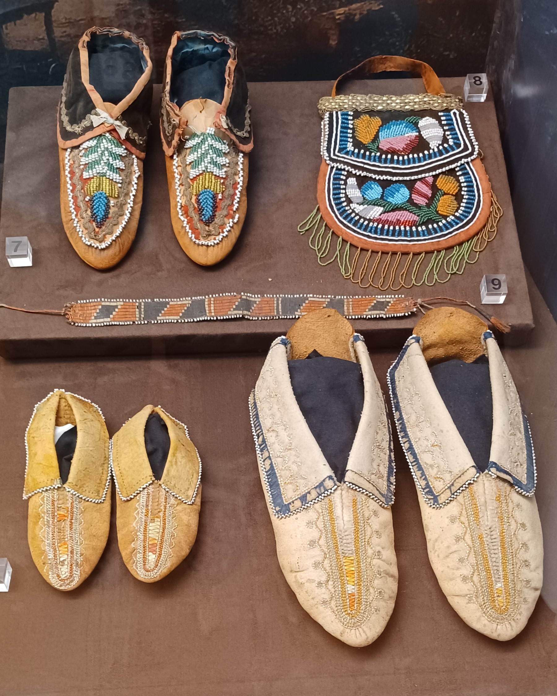 The exhibit also includes some new-to-me Indian artifacts. The second photo (below) shows a bag in a caribou hoof dating to the end of the 18th century, and a beaded bandolier dating to about 1880. The tray at lower right is Huron, dating to 1780 and is embroider on (I assume) birch bark. Not shown here is a beaver hat from the fur trade era which you could touch. It was much softer than I had expected.