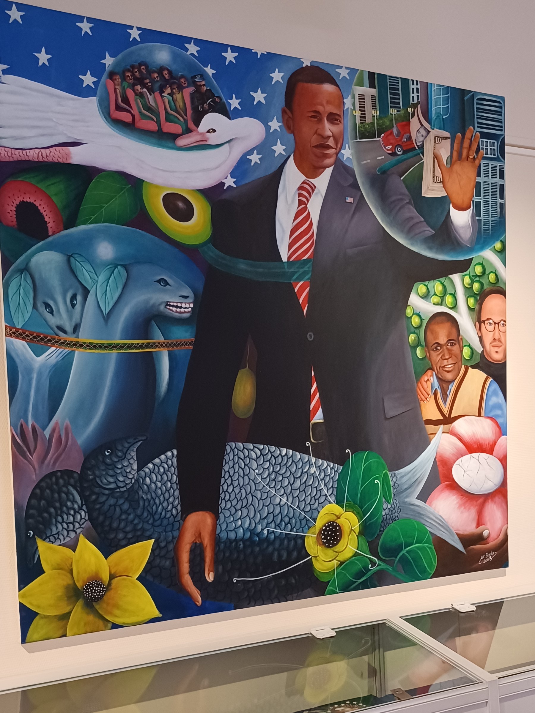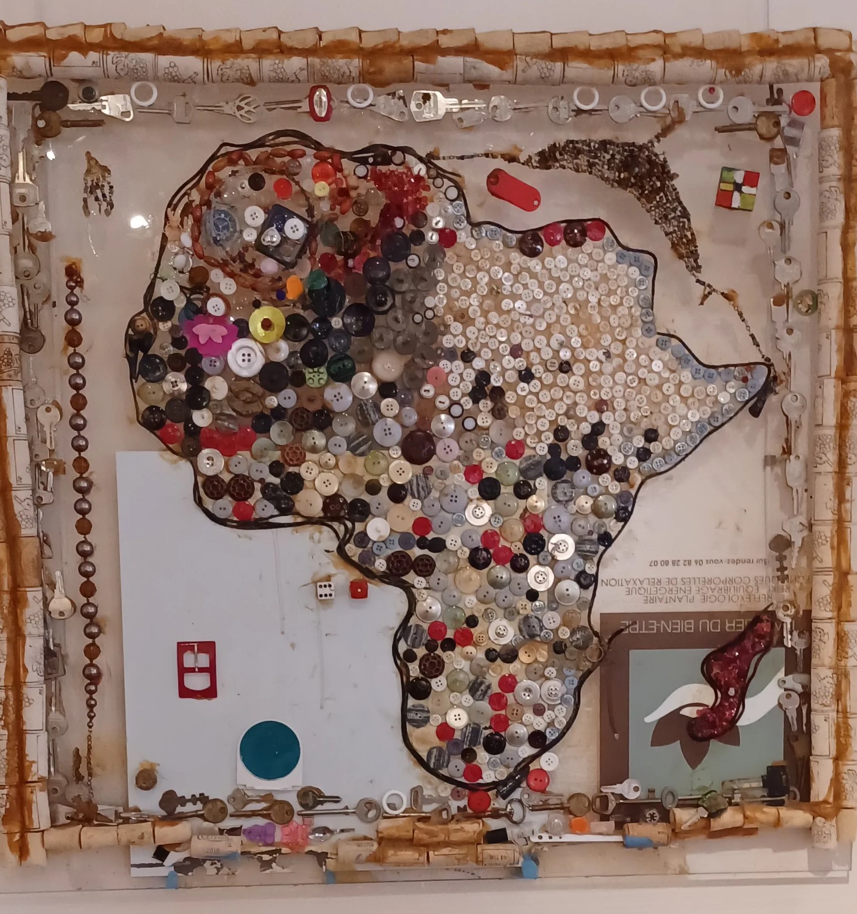 My tour ended on the top floor with a wall of Obama memorabilia including a large painting entitled “The World in Motion” by Pierre Bodo Pambu. The map of Africa is made from buttons, indicating the natural resources that Europe and American removed from Africa, with keys along the borders to indicate Africa’s loss of intellectual property.