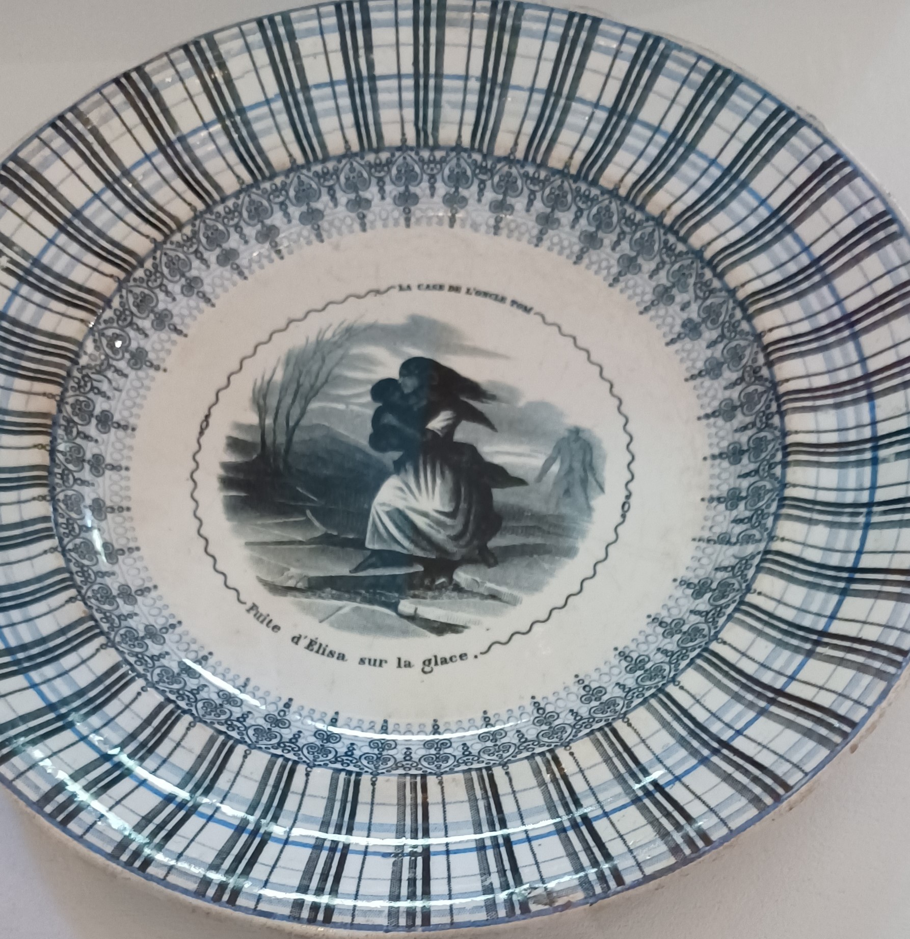 Slavery was a theme on china in a few museums I visited in France. I learned that France went through Abolition twice – once in 1791-92, and again in 1848, after Napoleon Bonaparte had re-established slavery in the French colonies in 1802. The first piece here is a salad bowl dating to 1785, depicting scenes from sugar plantations in Saint-Dominique. The motto reads “Long live the beautiful work from the American islands.” The second plate depicts a scene from Uncle Tom’s Cabin which dates to 1852, the same year the book was published.