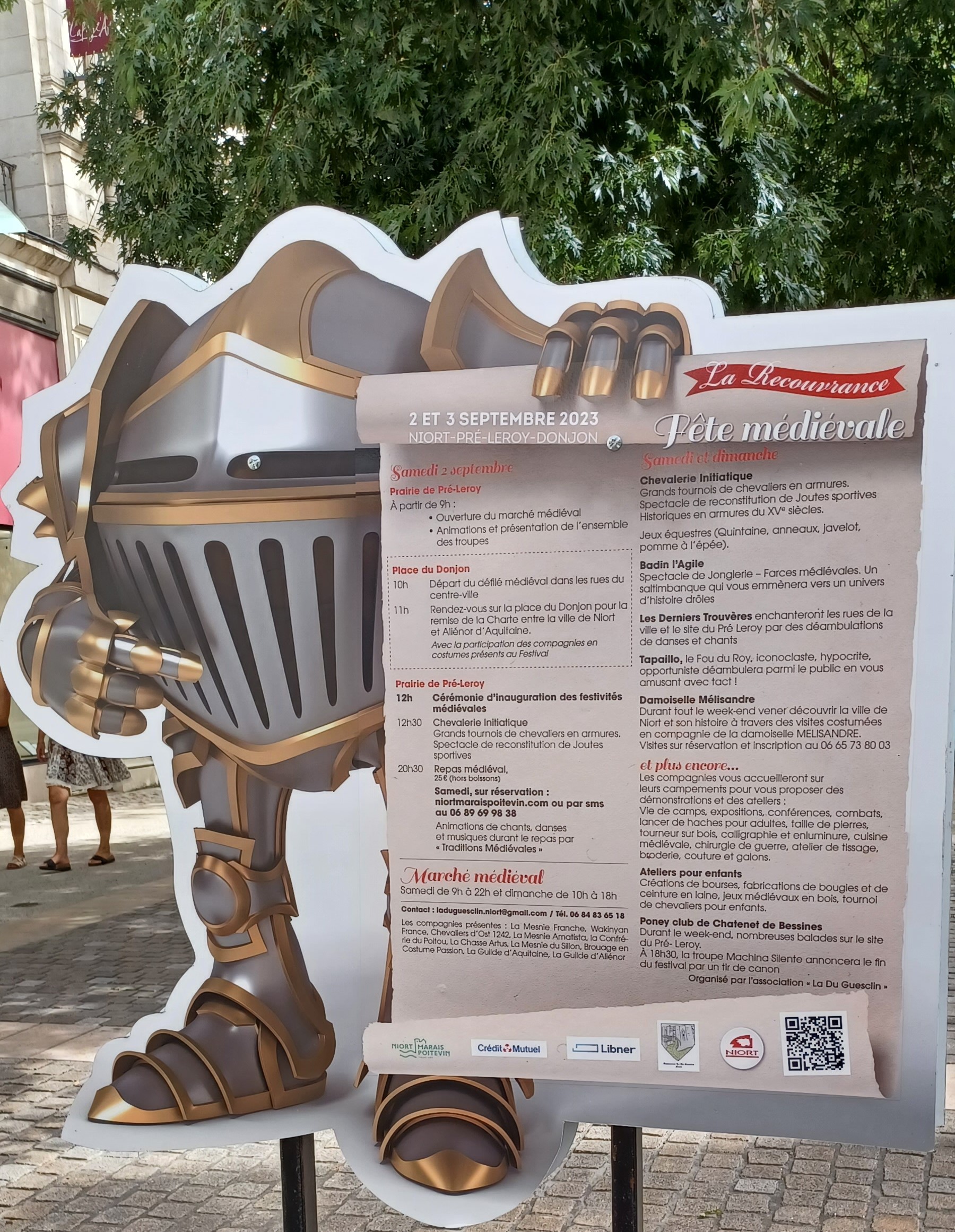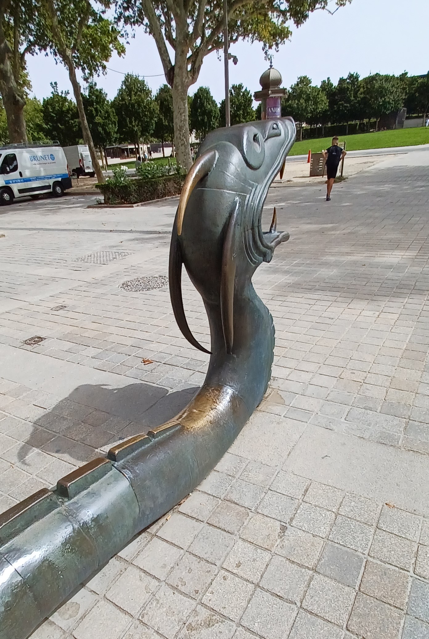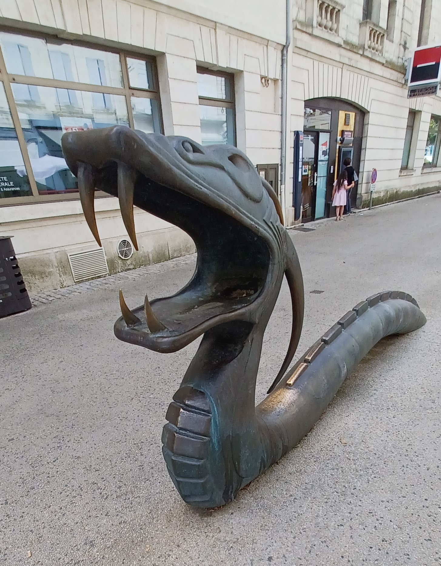 I arrive with my new chapeau to Mazette! Le Chateau at about 7:30 PM, after waiting for a city bus I thought would never come, but which allows me to admire the Dragons of Niort which are across the street and mark the entry to the commercial district. According to legend, the city was terrorized by a dragon that terrorized the city in 1692. A convicted soldier, Jacques Allonneau, stabbed the dragon with his sword; in its death throes the dragon fell on top of Jacques and both of them died.