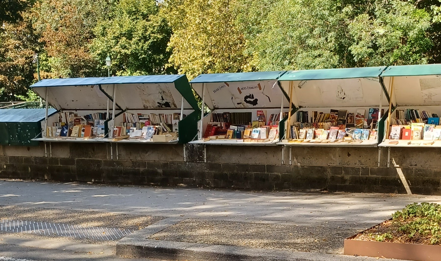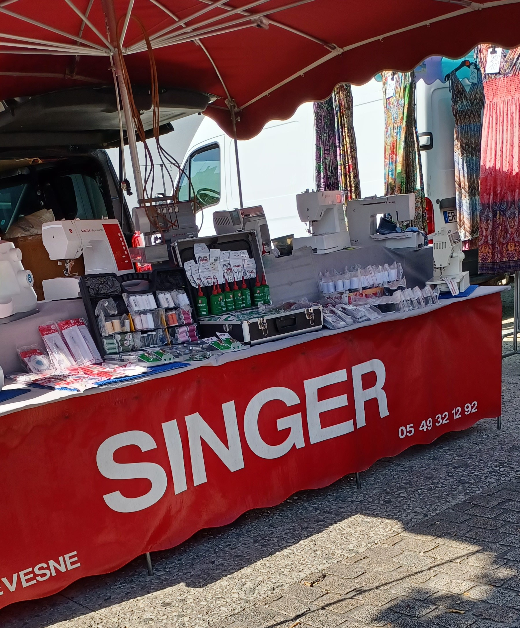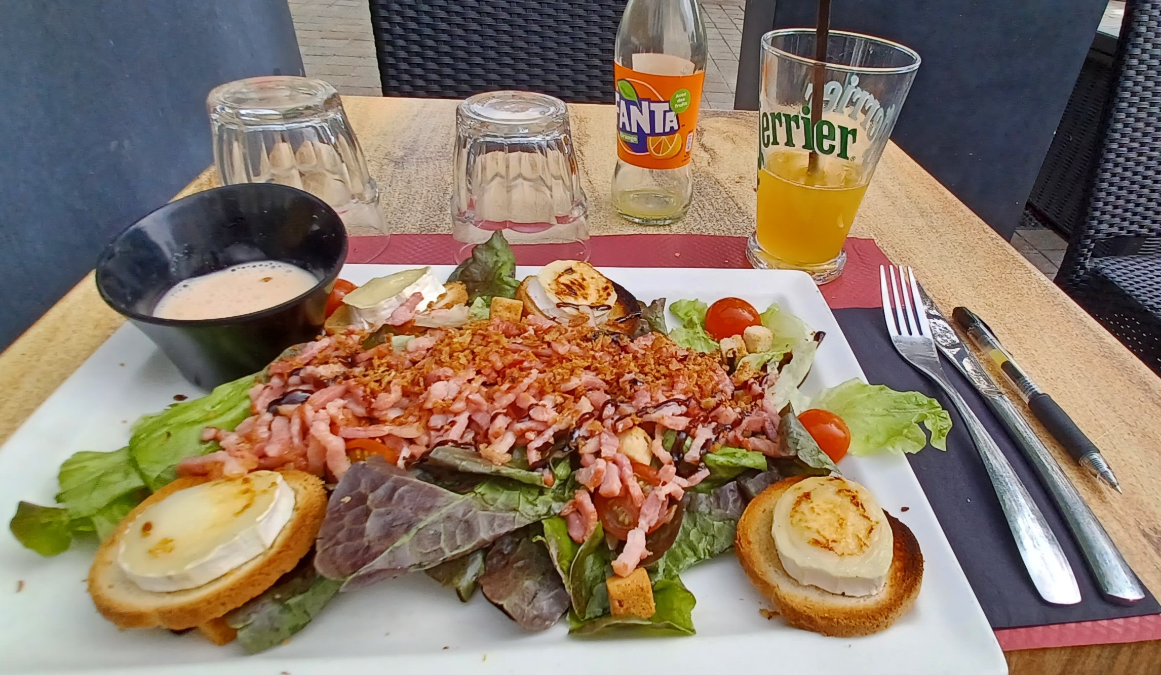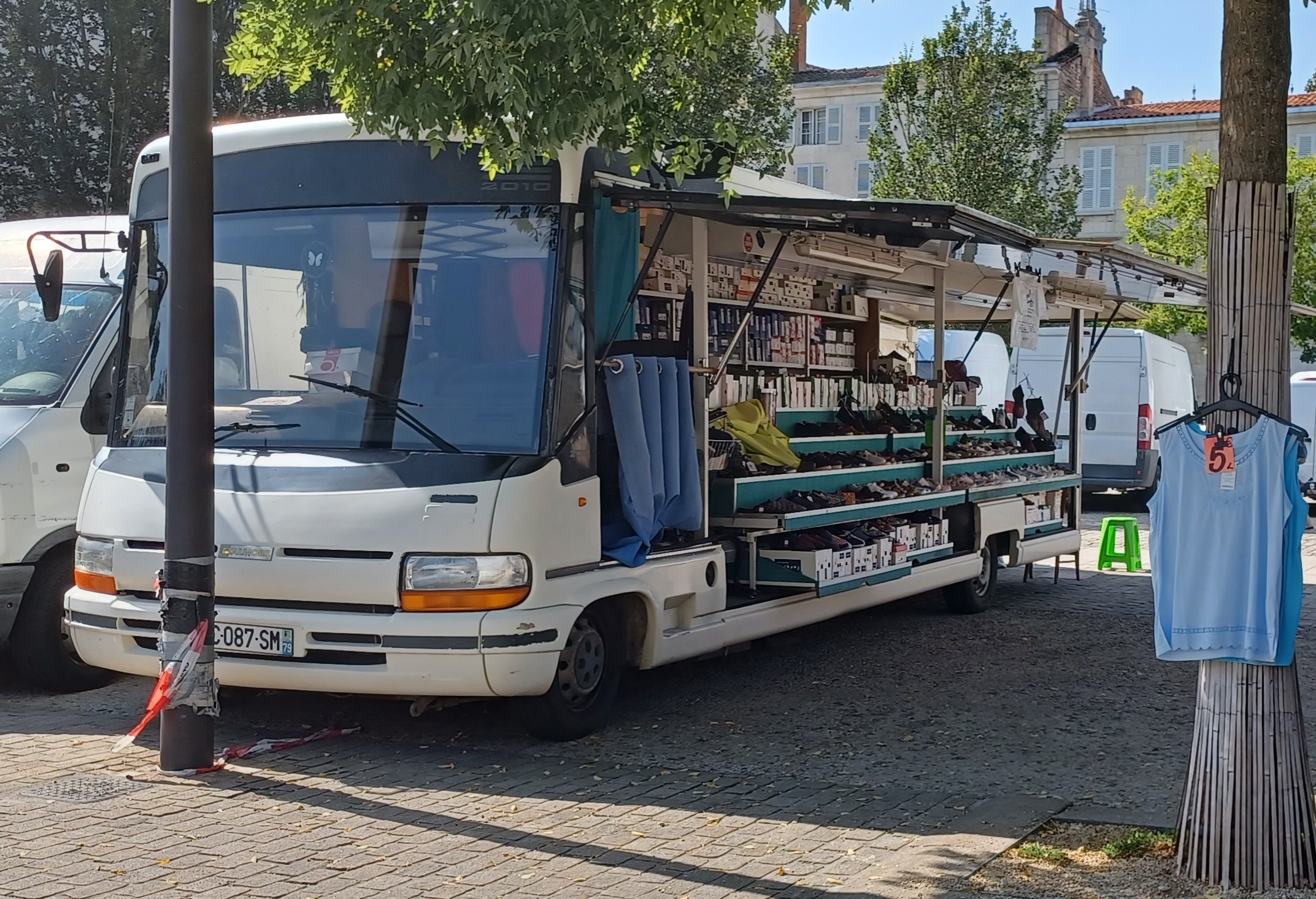 There’s a covered market in the town square at the base of the Donjon, and a ‘farmer’s market today, but unlike the one in Nantes, it’s as much clothing and household goods ad farmer’s produce. There’s a customized bus that opens out into a shoe store. There’s a Singer Sewing booth selling new machines and threads. I see a free book stall across the street that takes up half the block. On my way back to the bus stop, I find a restaurant and order a salad that comes as mostly meat, with chevre on toasts on the side.