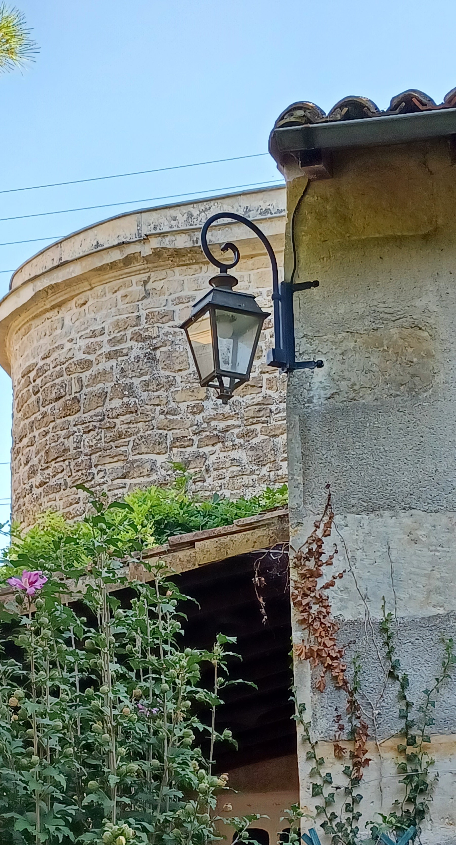 The chateau is surrounded by a manicured lawn studded with a flowering trees, an olive and a citrus. The dining terrace has a street lamp at the corner and is edged with raised flower and vegetable gardens. There’s a swimming pool, which Kevin encloses in the winter to use as a hothouse. A staircase leads down to the lower property with a green area surrounded by old growth trees and access to the Sevre River by canoe. It also offers a spectacular view of the front of the chateau.