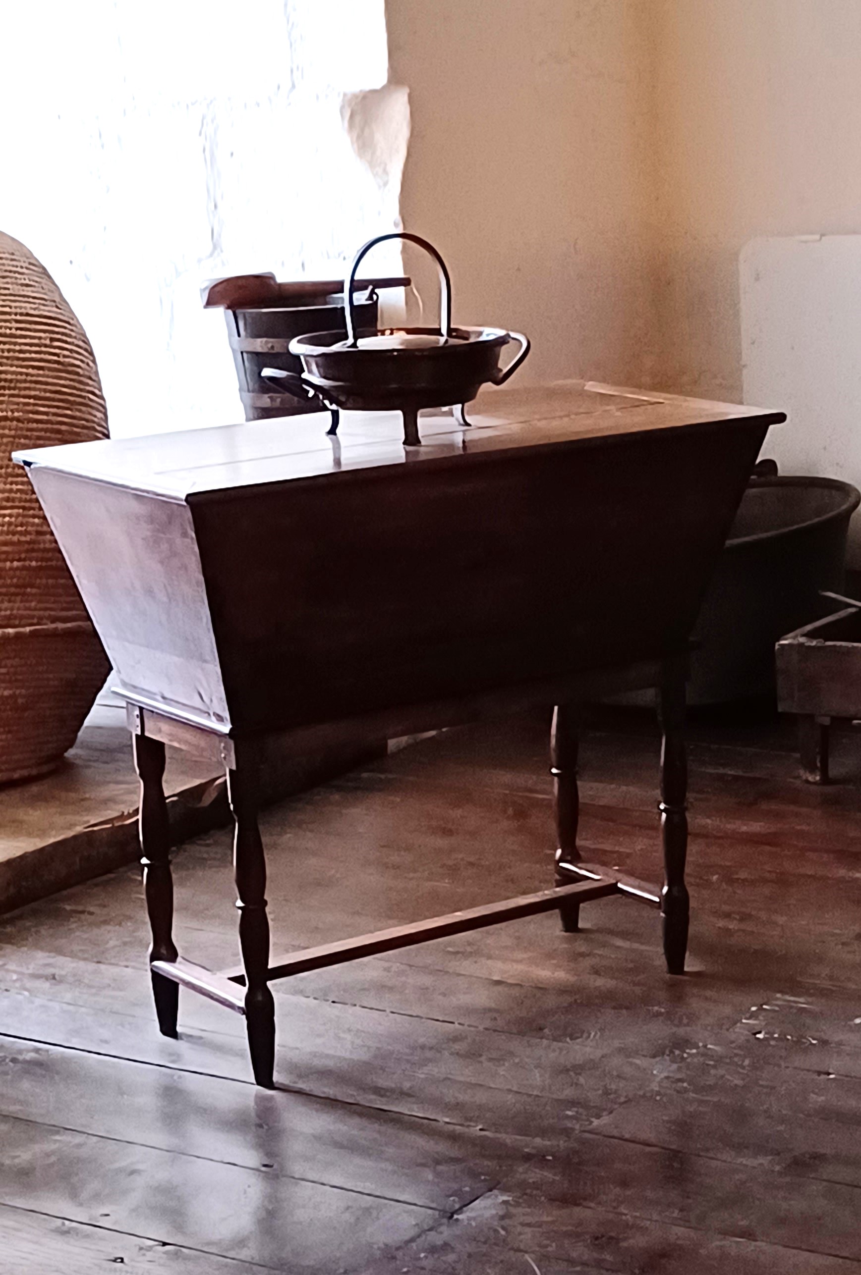 Shown below are some of my favorite pieces: a pumice water filter, a framed bedwarmer called a monk that was used in France up to the introduction of electricity to homes in the early 20th century; a dough box used for kneading bread and allowing it to rest in a warm and draft free area, which aids in its rising.