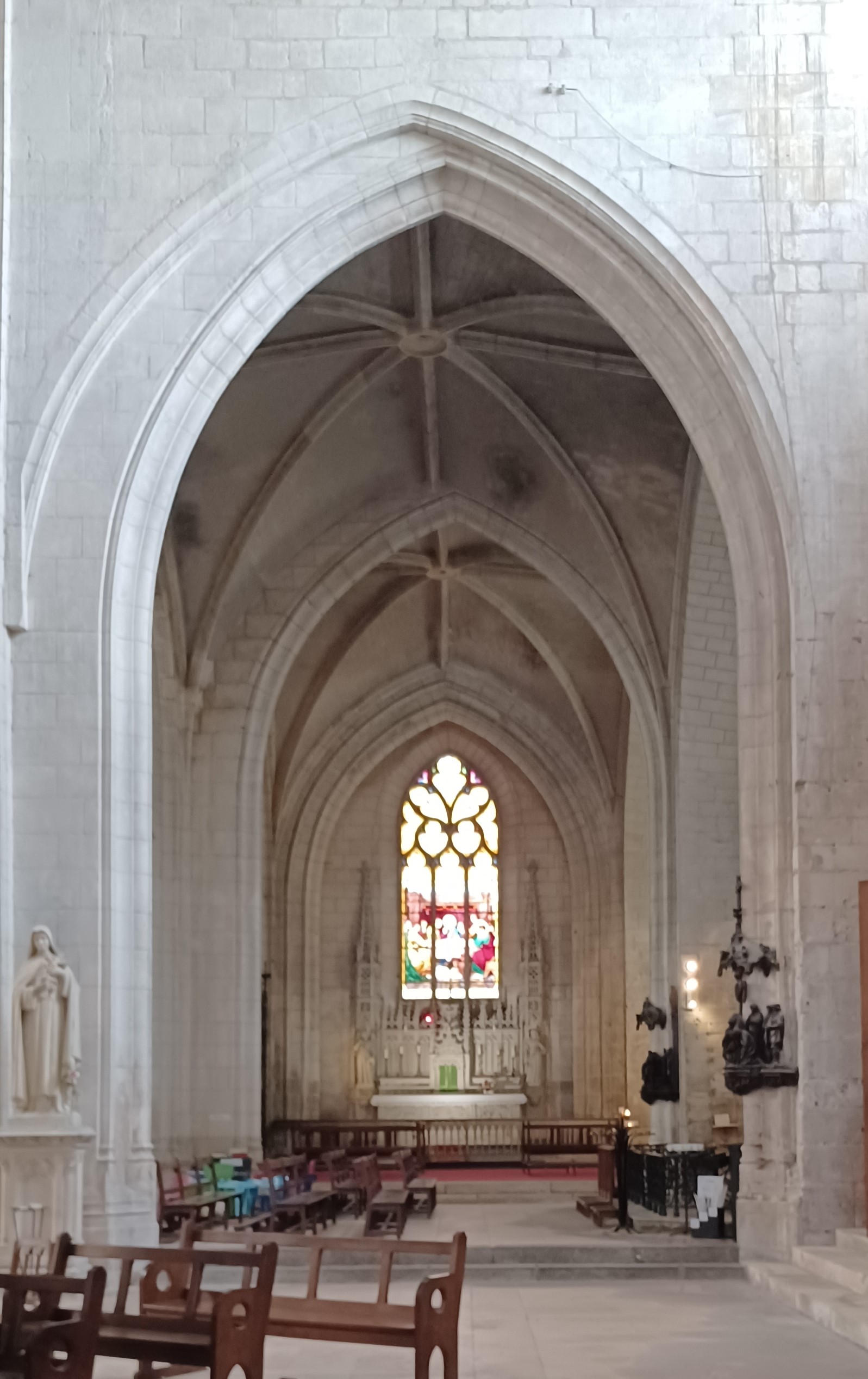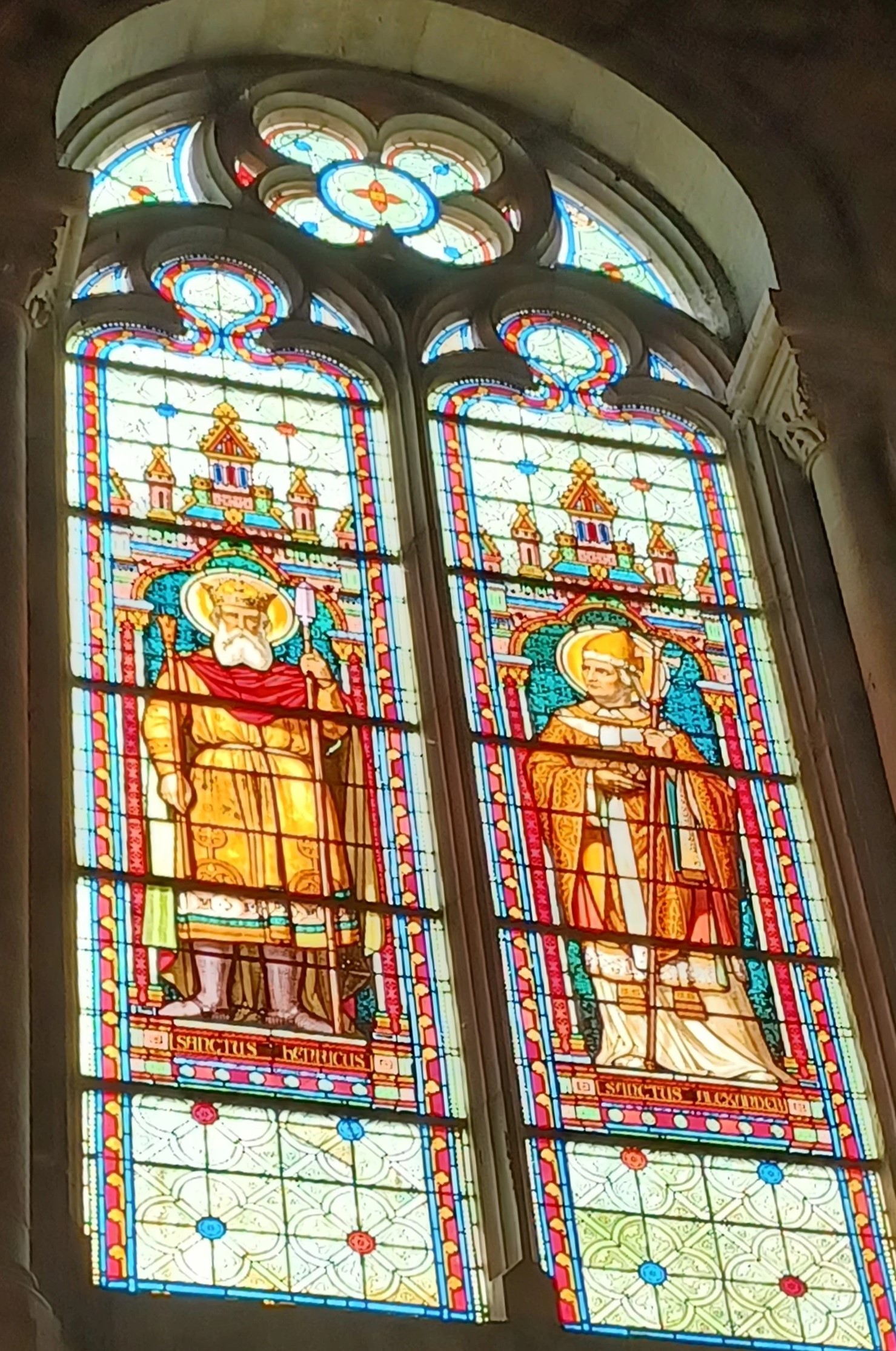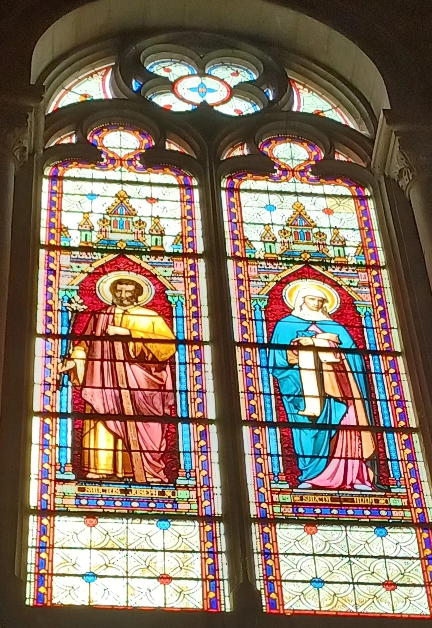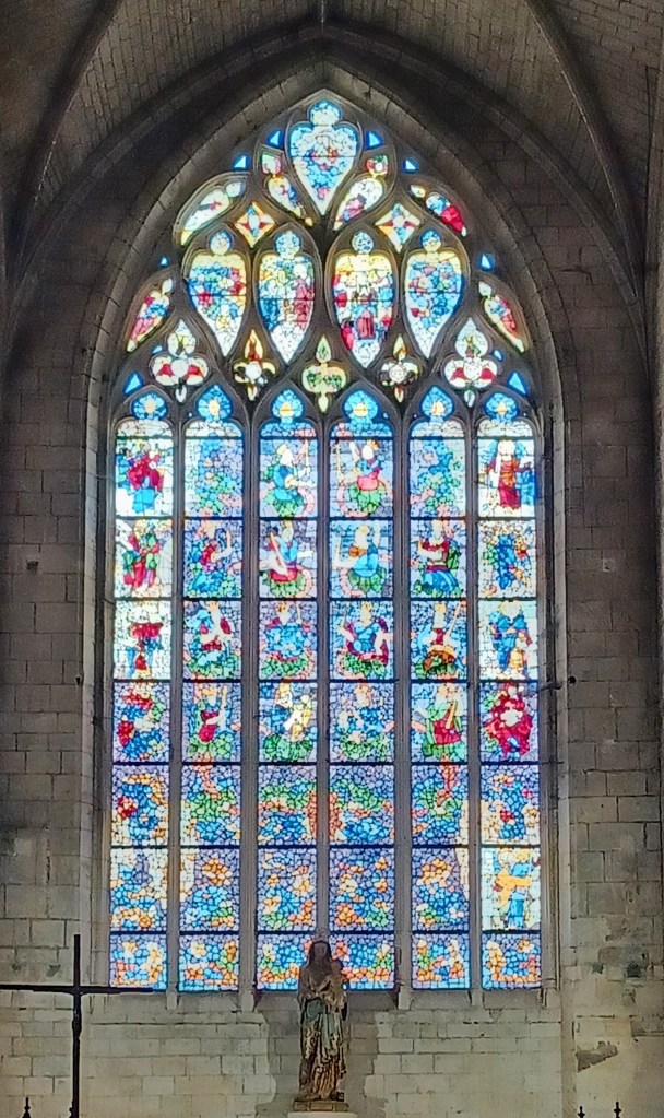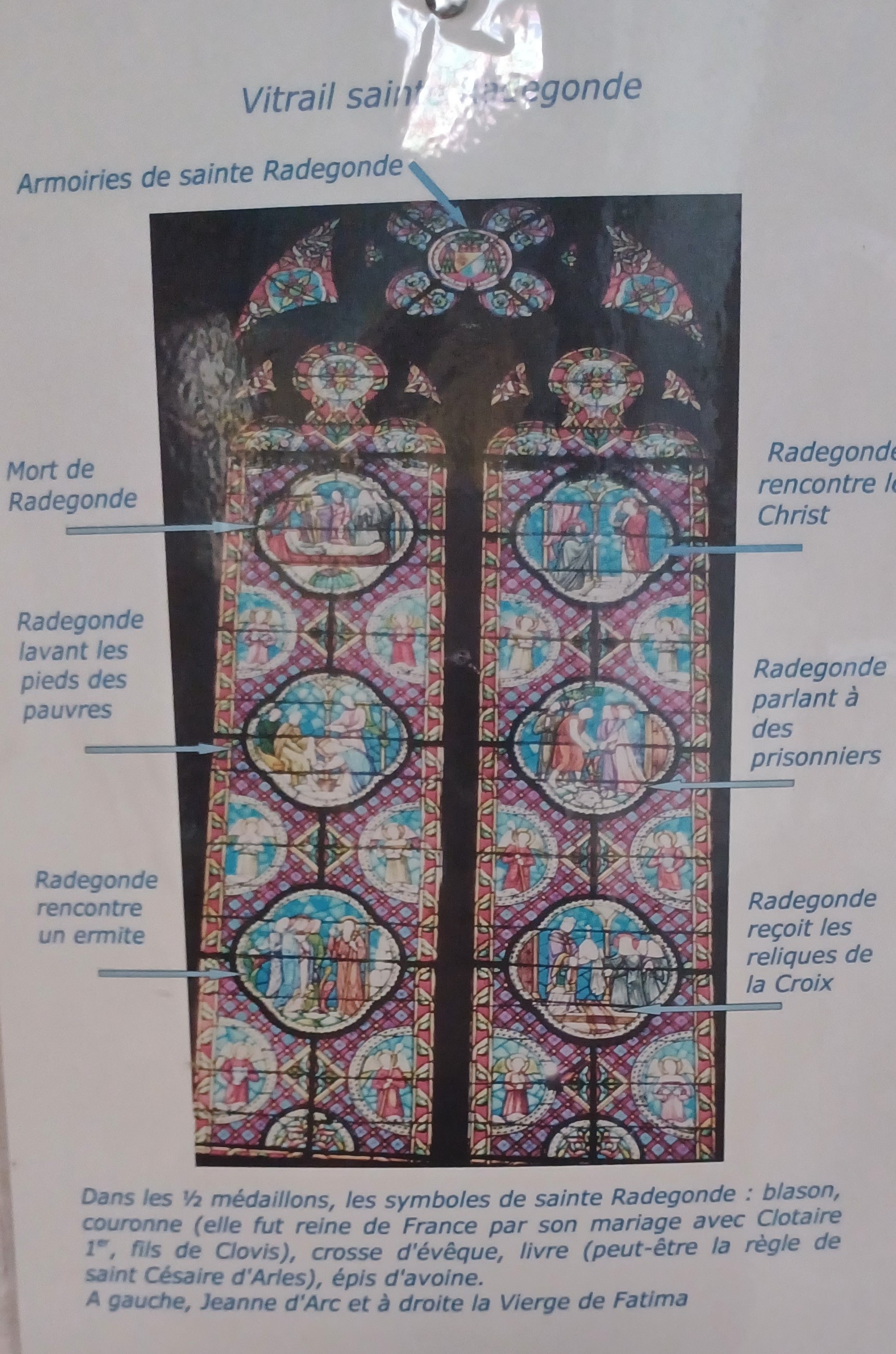 The most interesting glass depicted scenes from the life of Saint Radegonde, a 6th century Frankish queen and ascetic who founded the Abbey of the Holy Cross at Poitiers, named after a relic she received from Emperor Justin II. She is the patron saint of several churches in France and England.