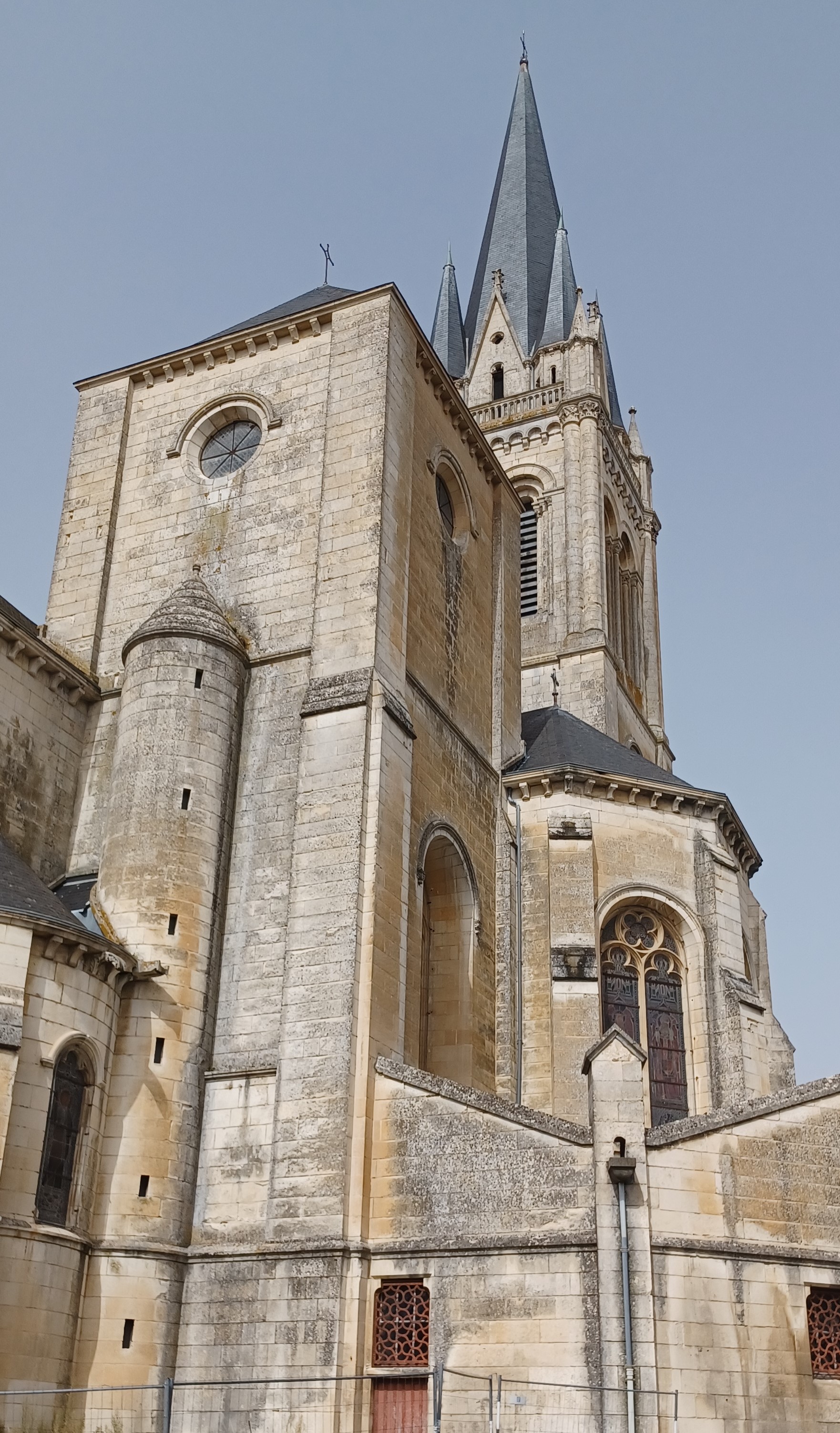 Built in the “Flamboyant Gothic style” of the late 15th century, it stands on the original priory built in the 11th century. Its bell tower is 75 meters high and is flanked with statues of the Four Evangelists about 2/3 of the way up. There are gargoyles around the base of the spire.