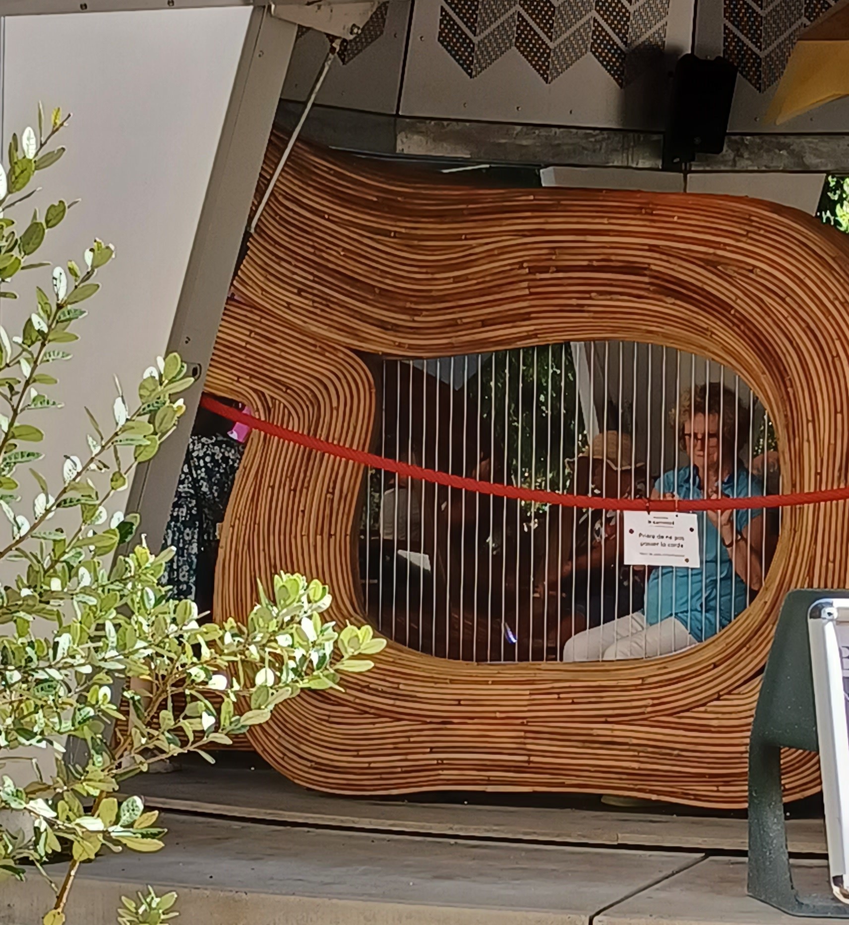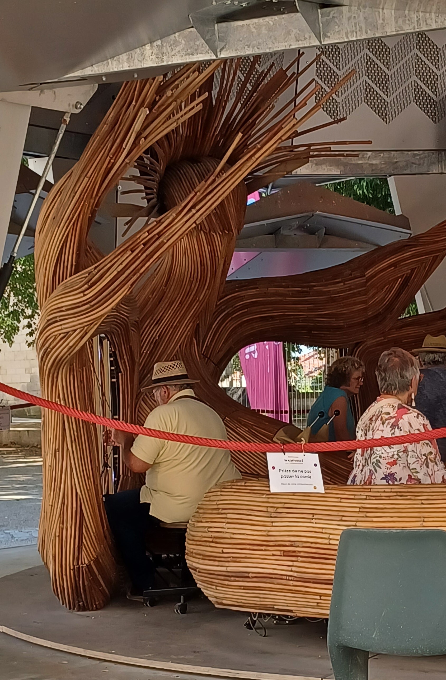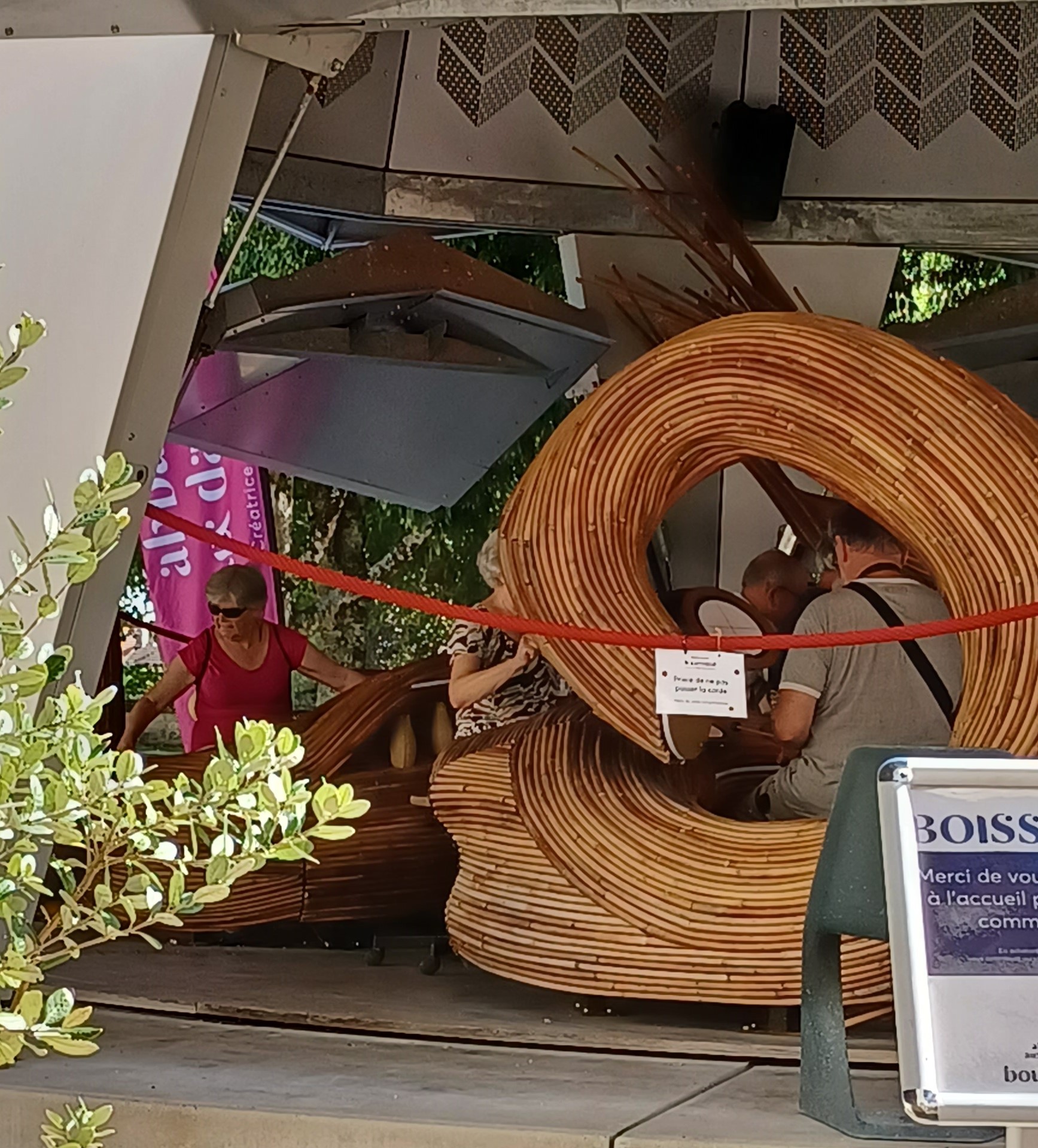 I look for a guide book in the registration building / gift shop but only find one in French. I am surprised to find that most people here speak better English than they will admit to. I ask about the large, pine cone-shaped structure outside. I am told it encases a carousel, where the riders become musicians and improvise music on digital harps, drums and piano during a 10 minute ride that costs 3 euros. I would see the next day that the electronics are wrapped in wicker structures, and after watching a few rotations, would realize that the largest structure is a phoenix.