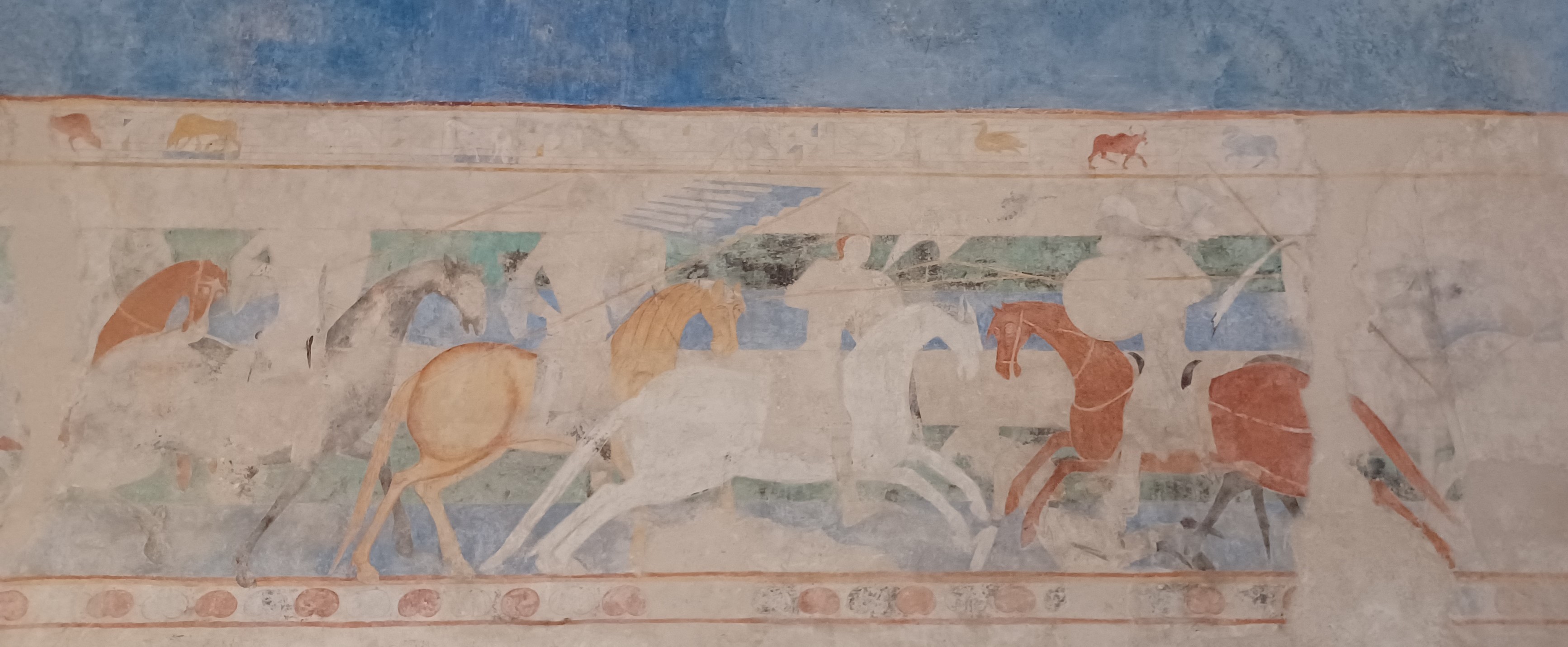 The Count’s Chamber has a barrel ceiling painted blue, and a fresco on the wall depicting the count’s battle against the Moors in Spain in 1118. In the center of this room is a 12th century ablutions fountain carved from white marble.