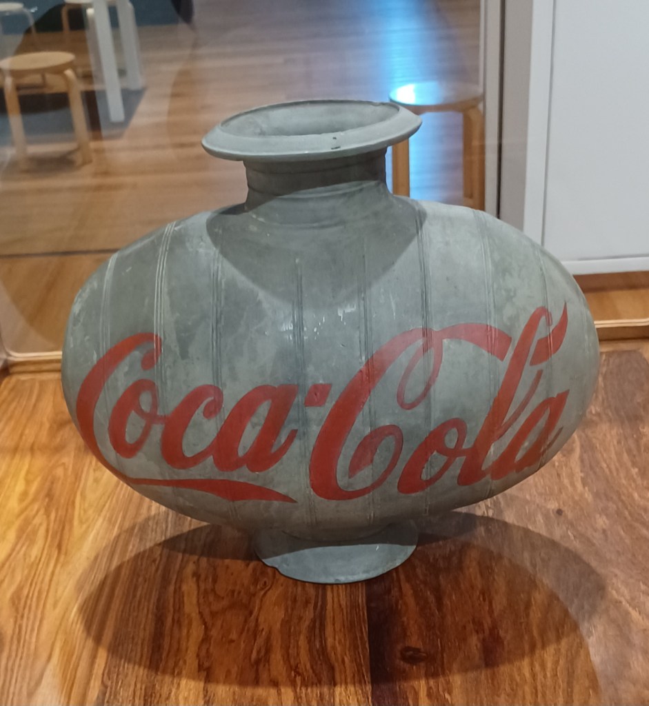 A case displayed Ming dynasty vase that Ai Weiwei painted with the Coca Cola logo, one of the first American corporations to sell their product in China.