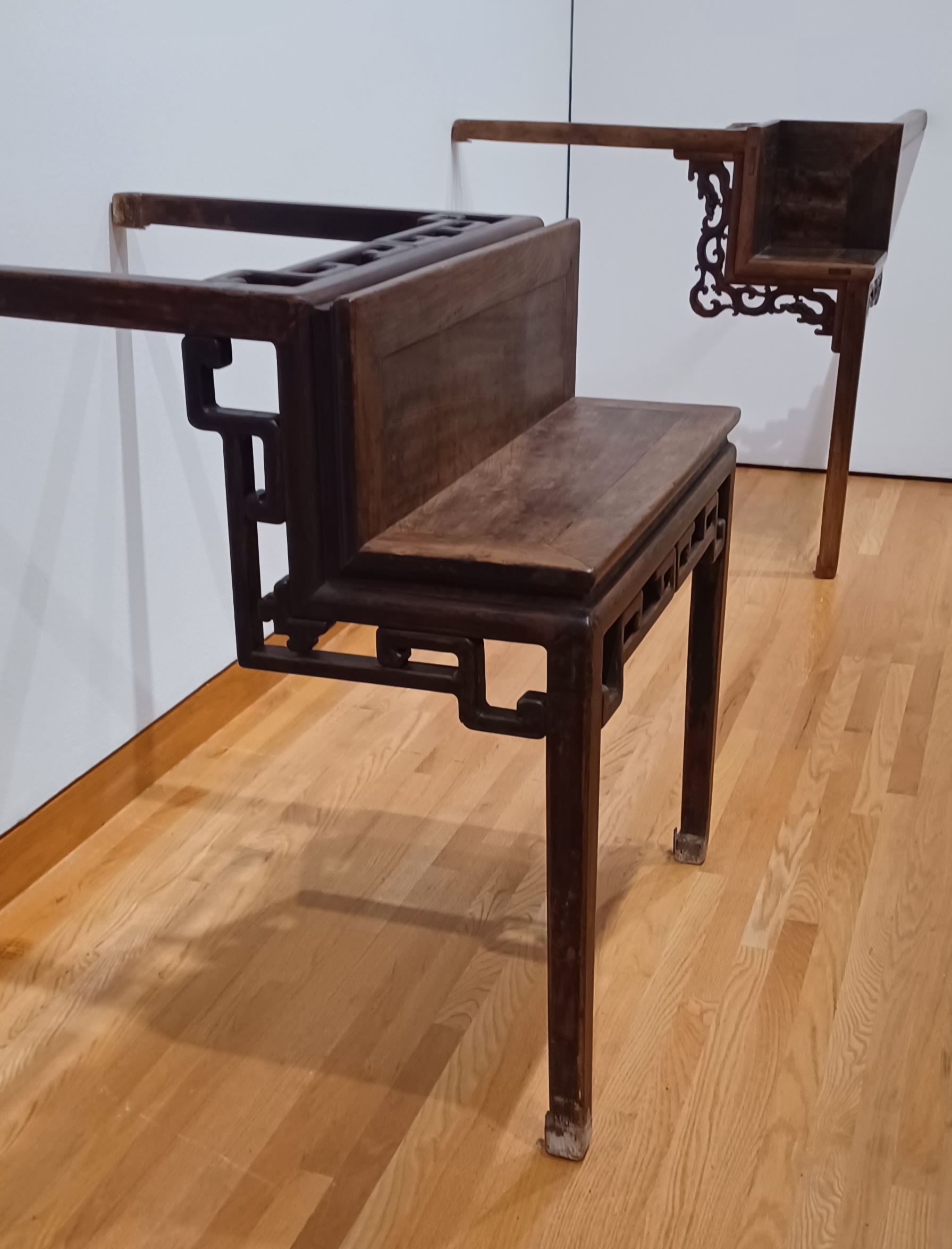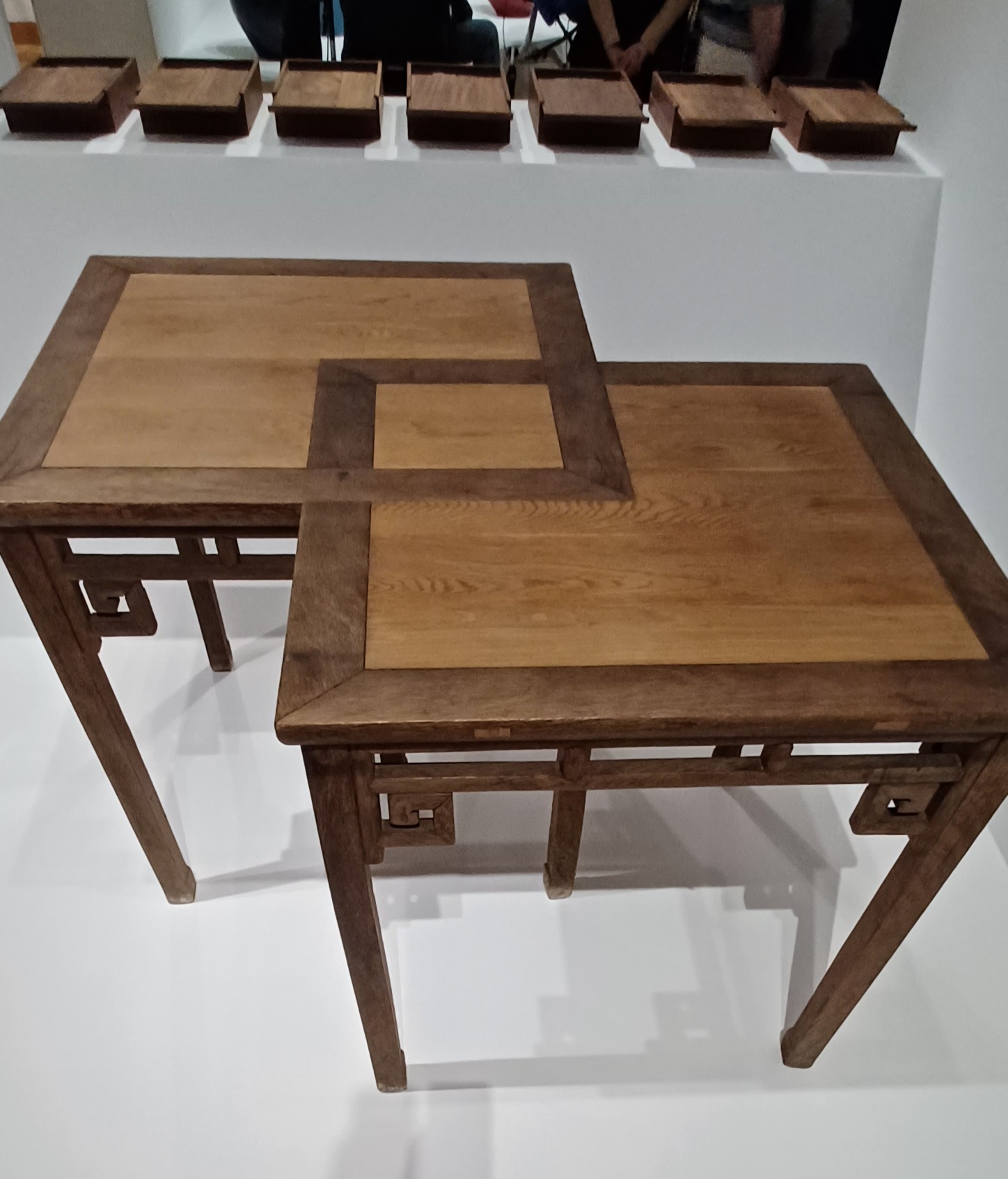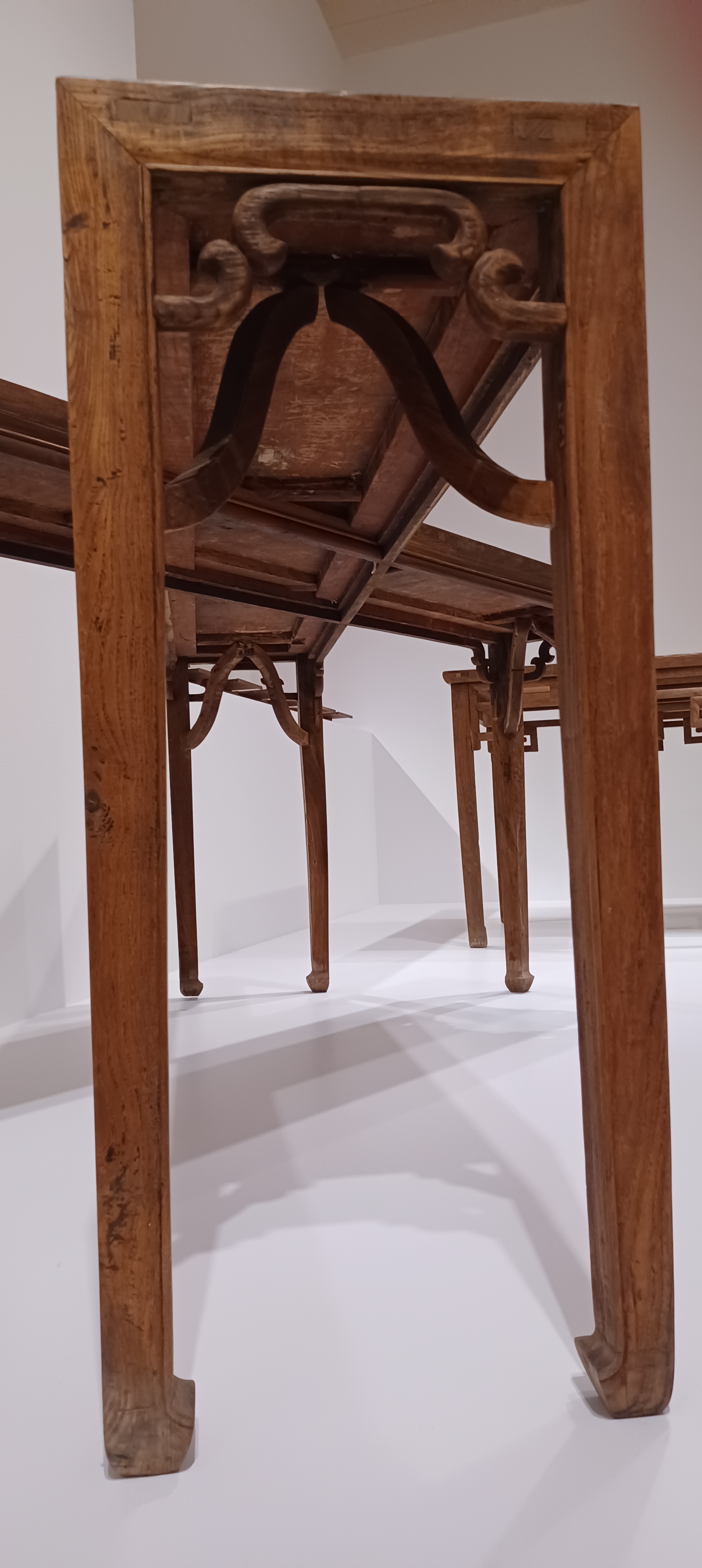 The original tables date to the Ming and Qing dynasties. Ai Weiwei hired artisans to tear them apart and reassemble them in new forms, using traditional joinery techniques. No nails were used in this process, and the artisans took great care to preserve the original patina. Other pieces in this exhibit were made from construction debris which Ai Weiwei used to meditate on cultural systems of value. Wood pillars, doors and windows salvaged from demolished buildings take on new forms, and challenge our idea of what is useful vs useless; trash vs. treasure; genuine vs. counterfeit. His work ultimately undermines the extreme positions of binary thinking.