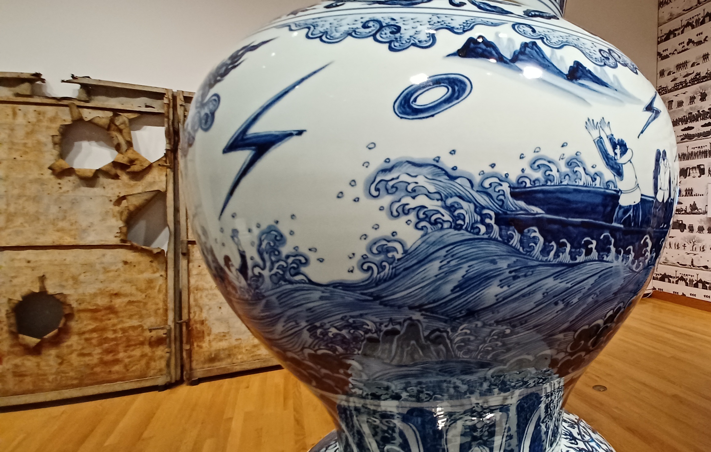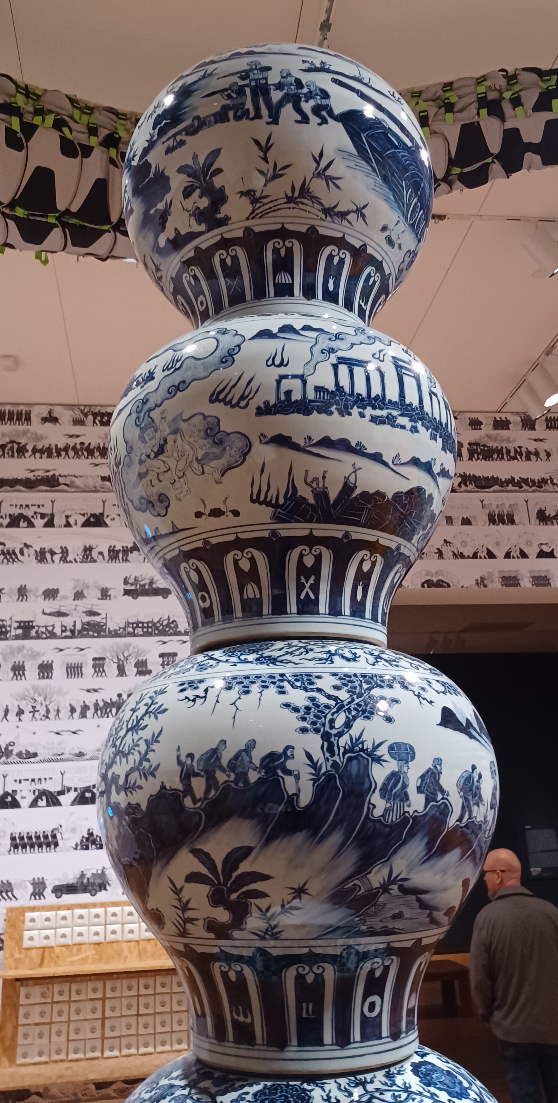 At first glance this appeared to be a stack of traditional porcelain vases glued together, until I stopped to study it and its stories of migration. The imagery combines traditional ceramic motifs such as dragons and flowers with images of repression including tanks, soldiers and refugee camps. The Eight Buddhist Symbols that would customarily ring the bases were replaced by what Ai Weiwei described as the Eight Needs of Refugees, including fire, a tent, good shoes, a life-buoy, and other necessities.
