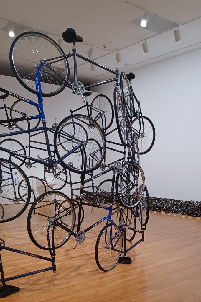 The bicycle sculpture of “Flying Pigeons” was in a room of its own, with a pile of parts along one wall that stretched the entire length of the room. It was an homage to when bicycles were the main form of transportation in China.